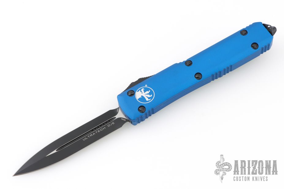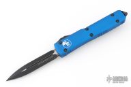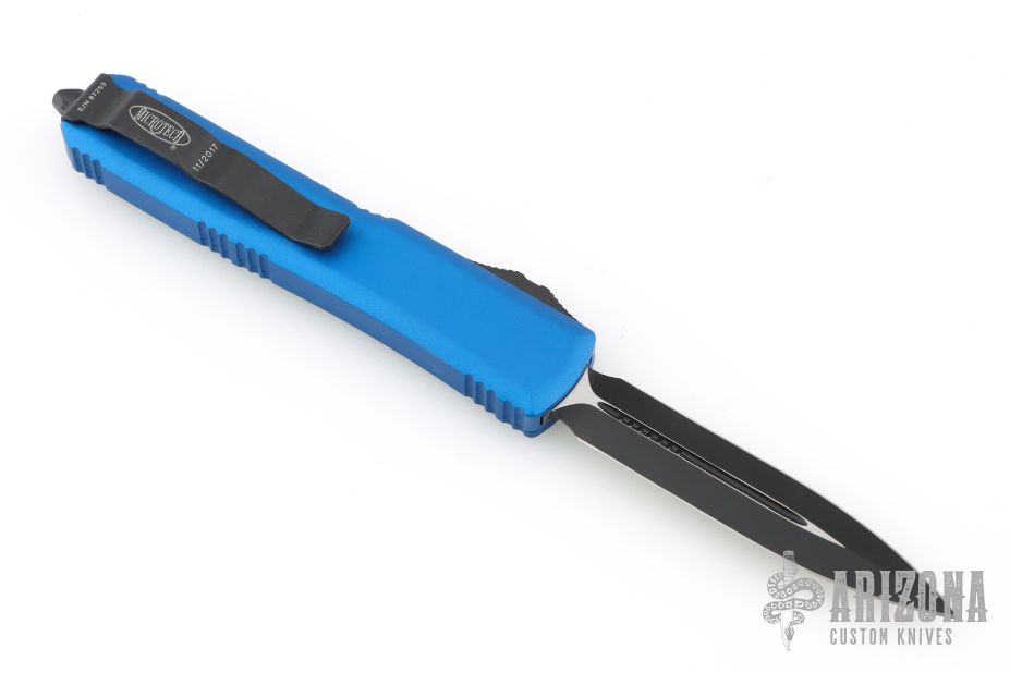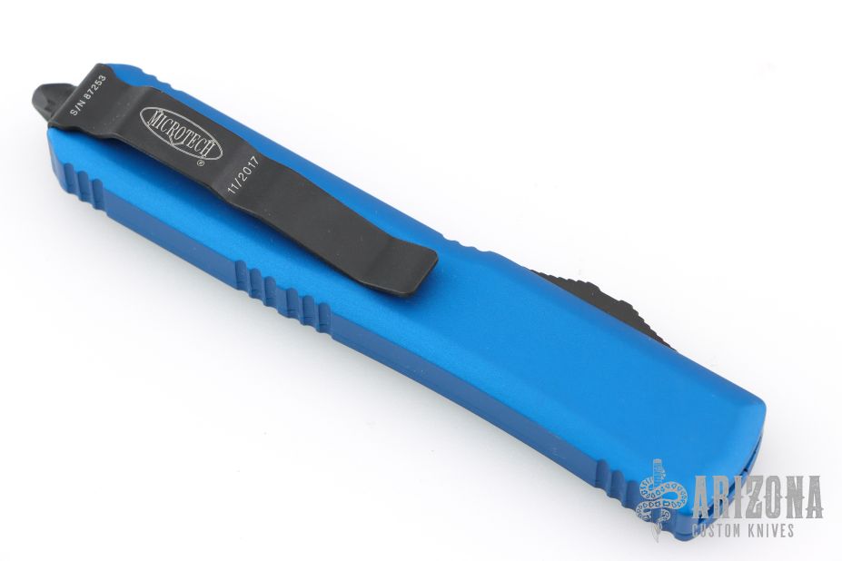 This Ultratech by Microtech features a black finished D/E blade. The handle has a blue aluminum frame with black hardware and tip down clip. Dated 11/2017 and s/n 87253. Excellent condition.