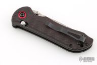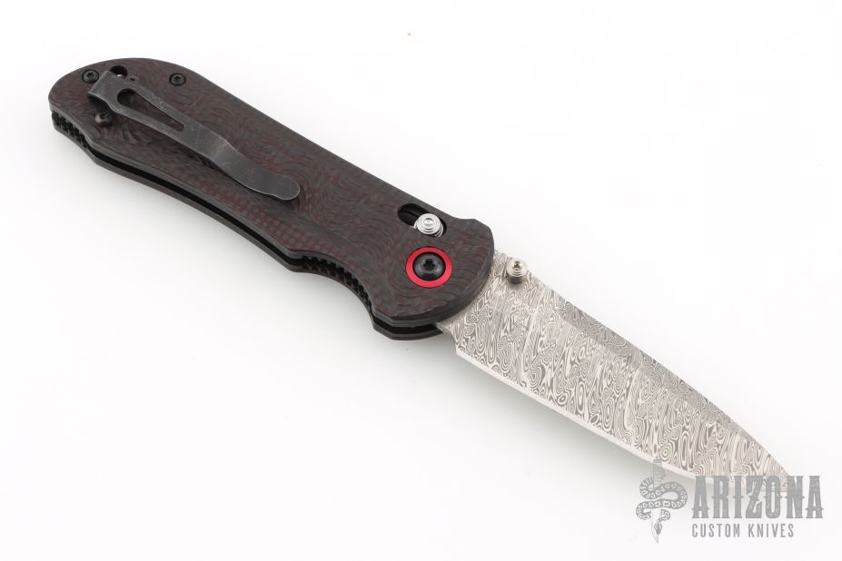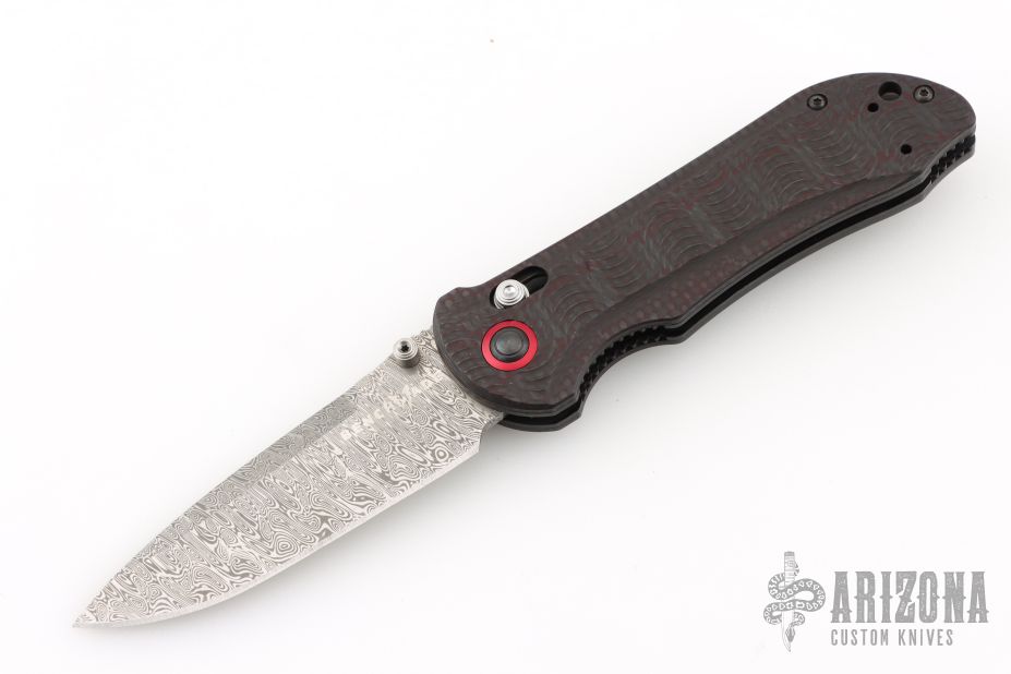 This Gold Class Stryker II from Benchmade features a drop point Odin Heim pattern Damasteel blade with swedge and dual thumbstuds. The handle is comprised of carbon fiber scales over blackened stainless steel liners and red anodized aluminum barrel spacers with matching pivot collar. Reversible tip up stainless steel pocket clip. Numbered #1970 on the blade. Includes original box and paperwork. Excellent condition.