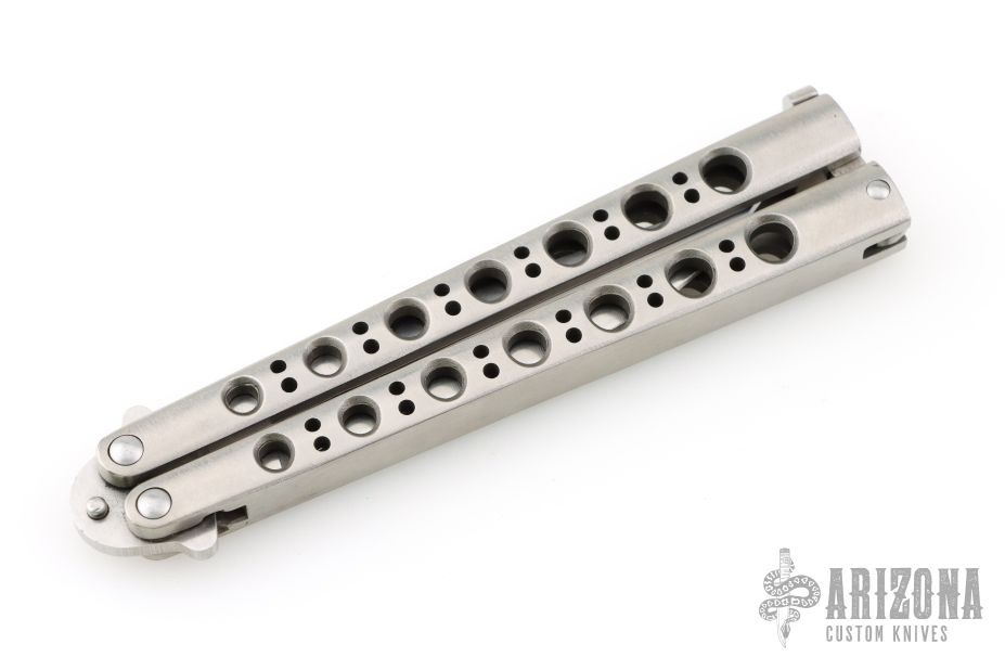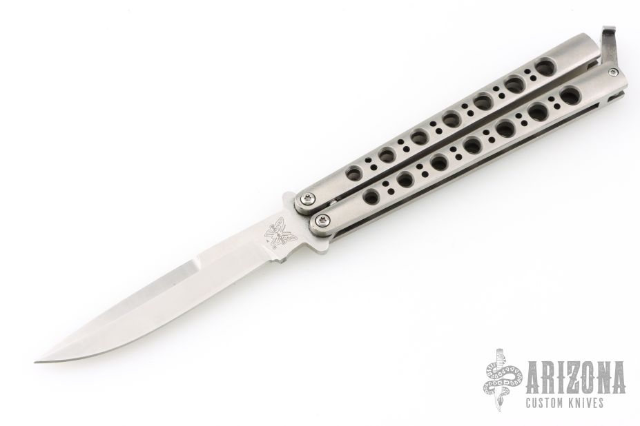 This Model 42 Balisong by Benchmade features a stonewash finished blade with swedge. The handle has an integral skeletonized titanium handles with T-latch on pommel. Includes original box, papers and nylon sheath. Has a couple light very light scratches, otherwise excellent condition.