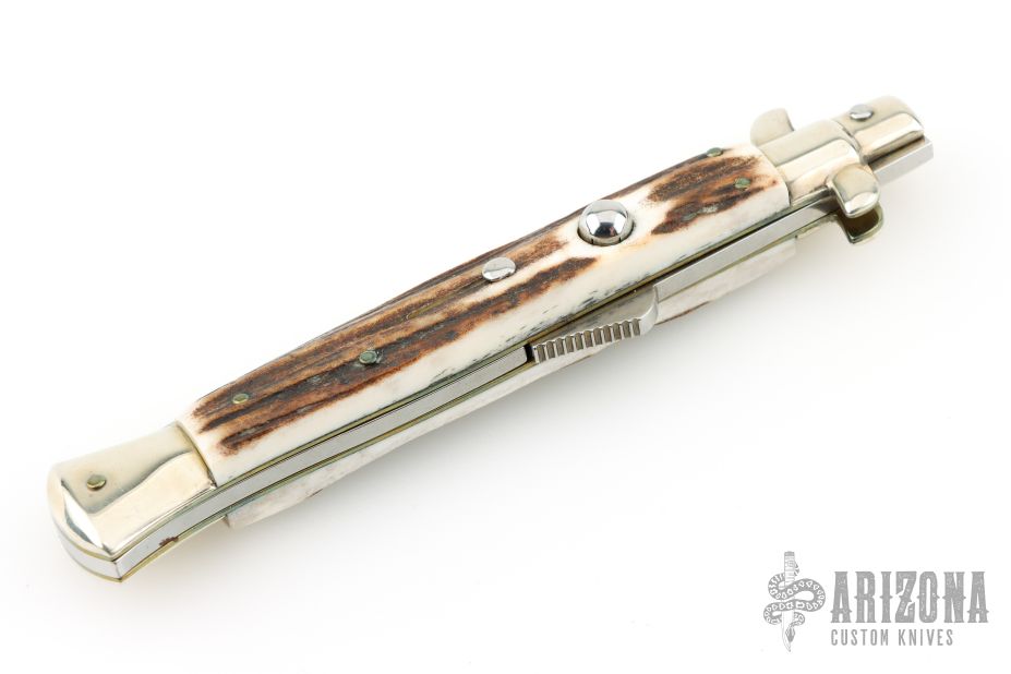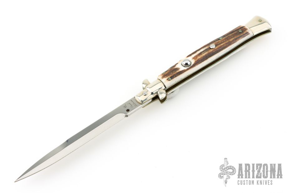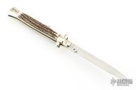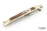 This Humpback Stiletto by Frank Beltrame features a tumble polished and tumbled bayonet ground blade. Coil spring auto. The handle has nickel silver bolsters, stag scales, brass liners and pins, stainless steel backspacer. Has safety. Excellent condition. "Limited Edition #11/2012" on blade.