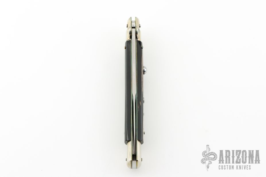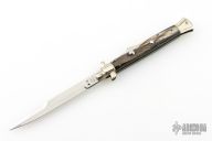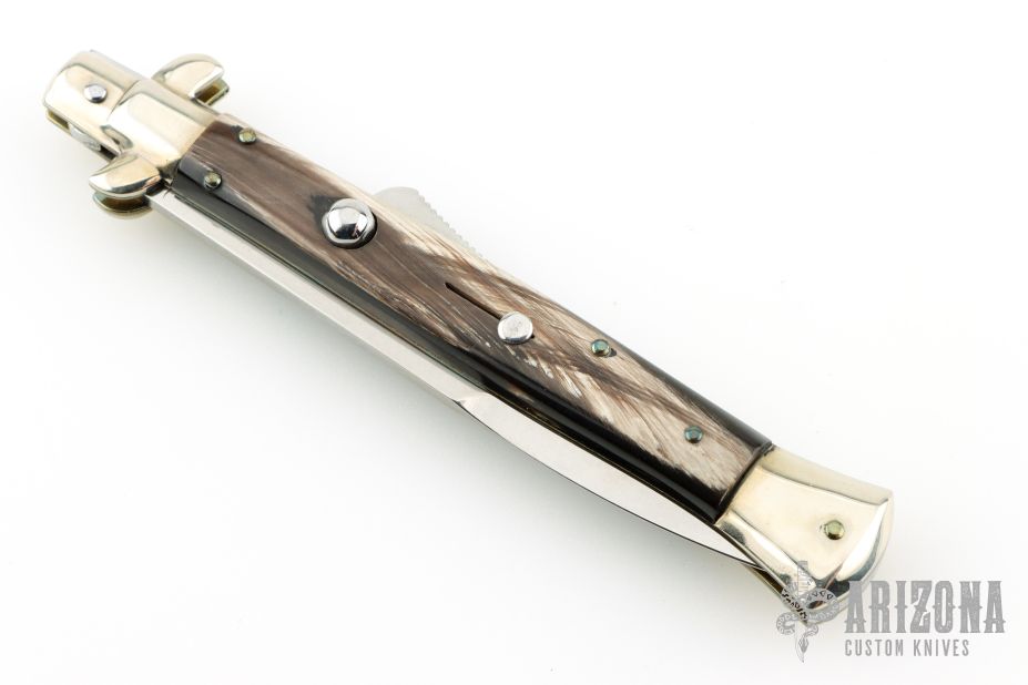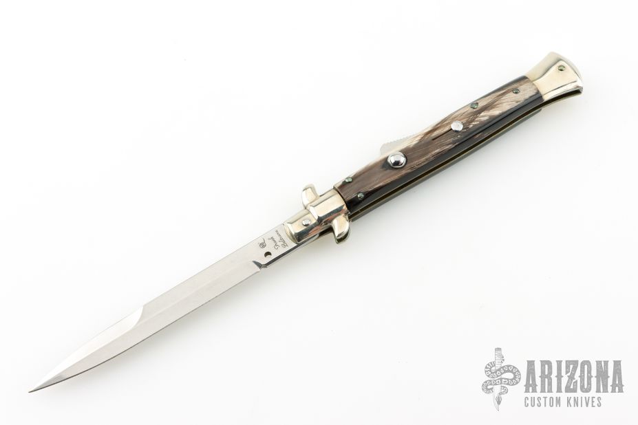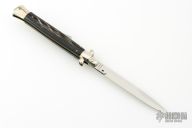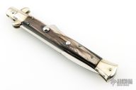 This Humpback Stiletto by Frank Beltrame features a tumble polished and tumbled bayonet ground blade. Coil spring auto. The handle has nickel silver bolsters, buffalo horn scales, brass liners and pins, stainless steel backspacer. Has safety. Excellent condition. "Limited Edition #14/2012" on blade.