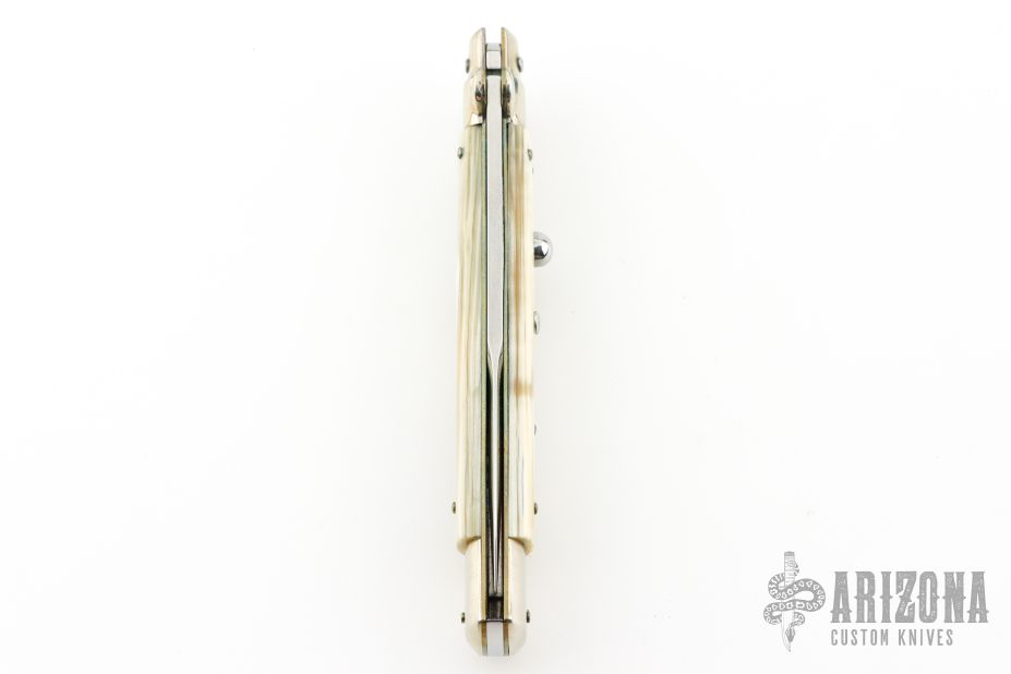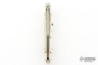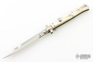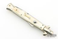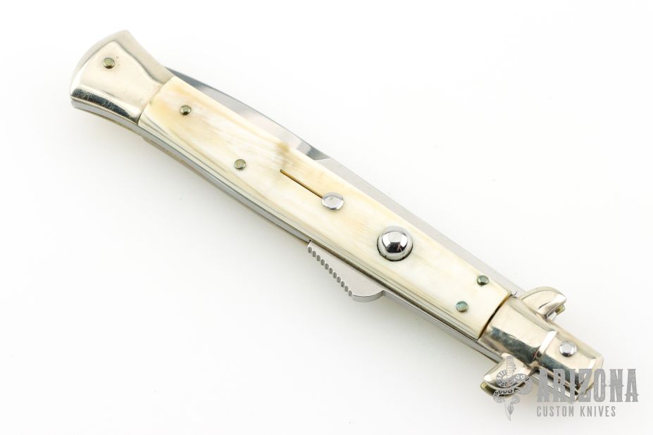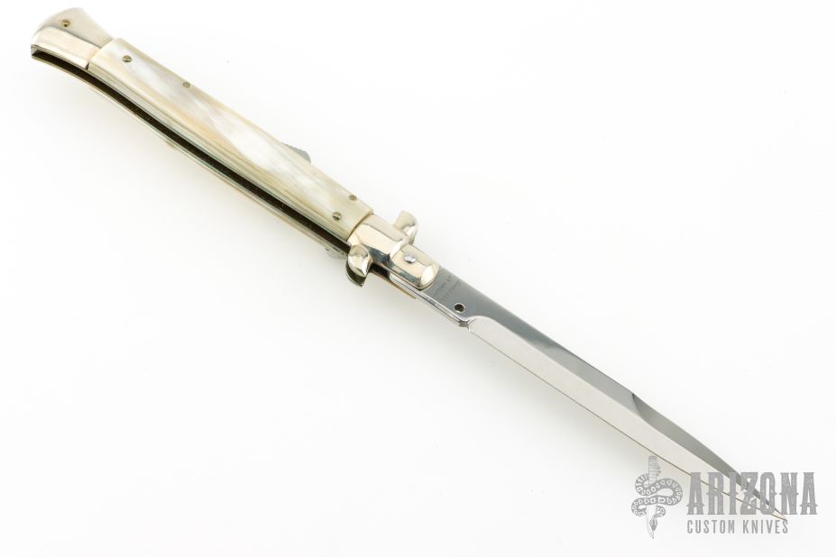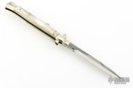This Humpback Stiletto by Frank Beltrame features a tumble polished and tumbled bayonet ground blade. Coil spring auto. The handle has nickel silver bolsters, honey horn scales, brass liners and pins, stainless steel backspacer. Has safety. Excellent condition. "Limited Edition #102/2012" on blade.