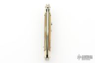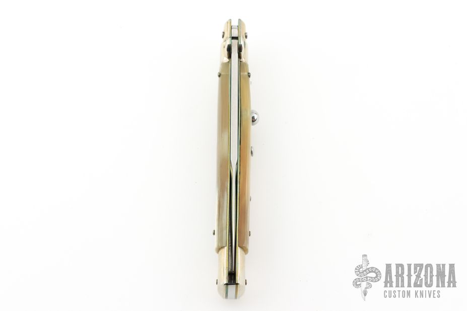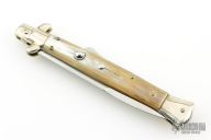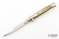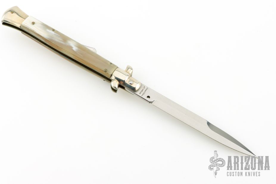 This Humpback Stiletto by Frank Beltrame features a tumble polished and tumbled bayonet ground blade. Coil spring auto. The handle has nickel silver bolsters, blonde horn scales, brass liners and pins, stainless steel backspacer. Has safety. Excellent condition. "Limited Edition #106/2012" on blade.