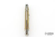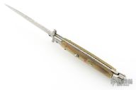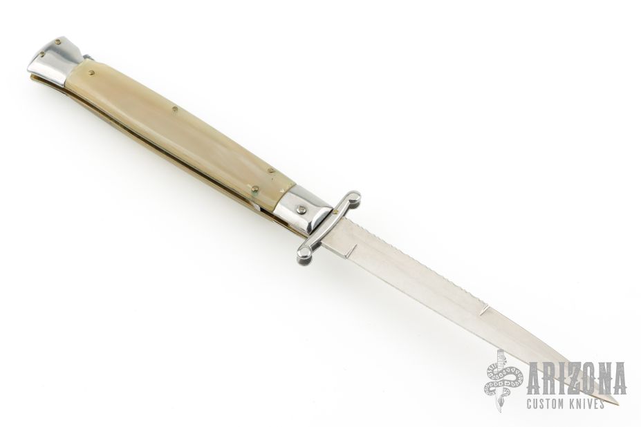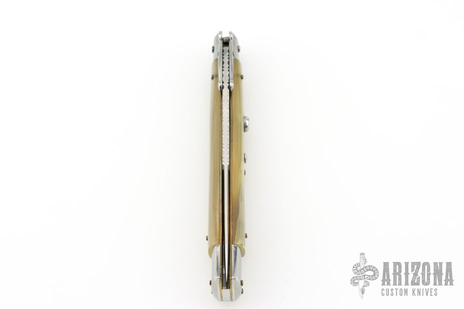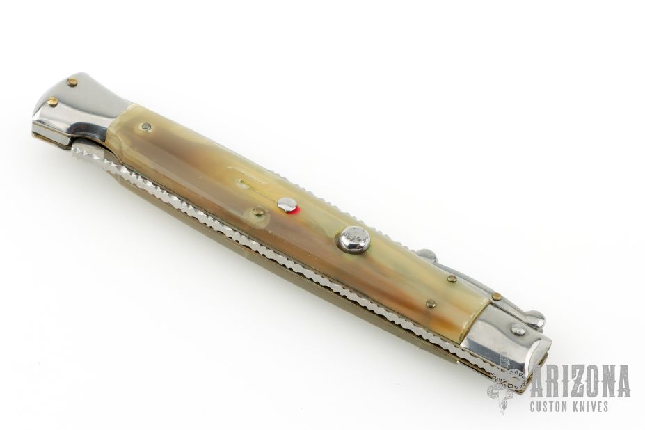 This 11" Swing Guard Auto by Frank Beltrame features a 3.5mm bayonet ground blade with false top edge and file-worked blade spine. The handle has stainless steel bolsters, front and rear, transparent horn scales, brass liners, file-worked stainless spring. Has a few light scratches, and some dings in the covers, Great condition otherwise.