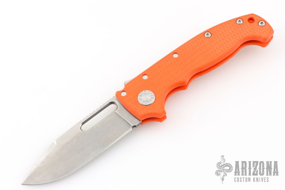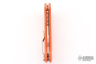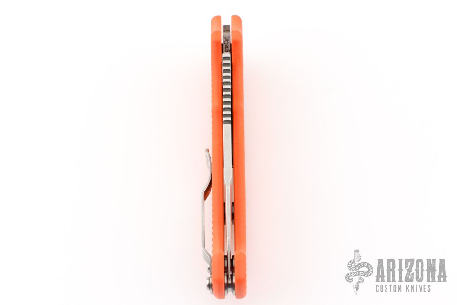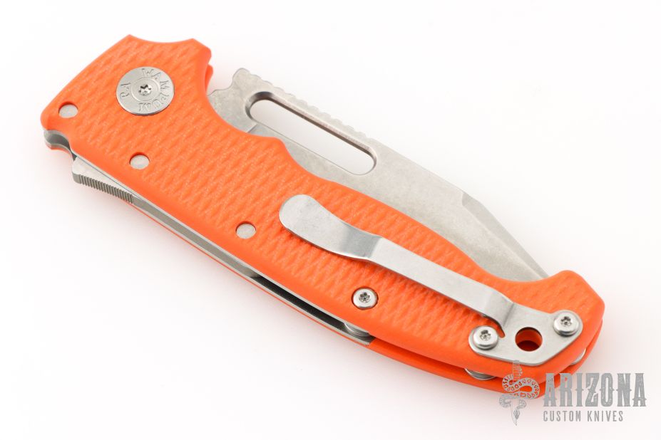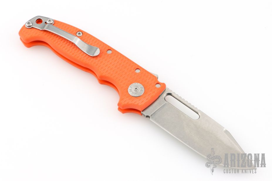 This AD20 by Demko Knives features a stonewashed clip point blade with notched thumbrest and a thumbhole.  The handle has a orange G-10 frame with a tip up stainless steel clip and "Shark" lock release on the spine. Comes with original box. Excellent condition.