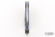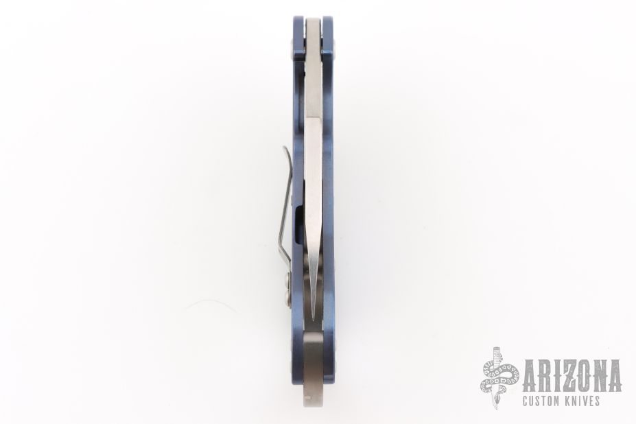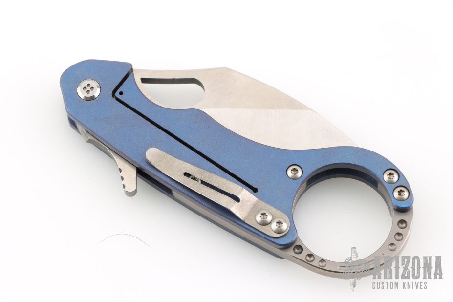 This Burung by Medford features a tumbled finished blade with thumbhole and flipper. The handle has a tumbled and anodized titanium frame with a tumbled titanium backspacer and a tip up reversible clip. Nice detent, lockup and blade seating. Comes with original hard case and papers, not original. Has a few light scratches otherwise the knife is in excellent condition.