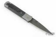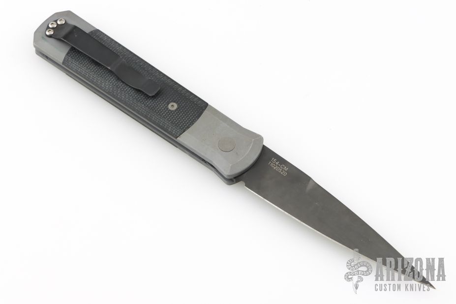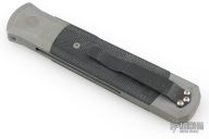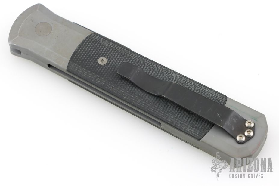 The Pro-Tech Godfather auto is one of the most popular designs in automatic knives. Features a double ground blade with a false top edge and a solid button release opening and closing. This model has a grey aluminum handle with black micarta inlays, and a black DLC blade. Has scuffs and scratches throughout, fair condition; good user condition otherwise.