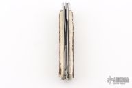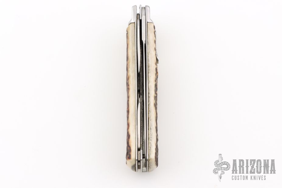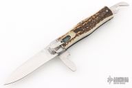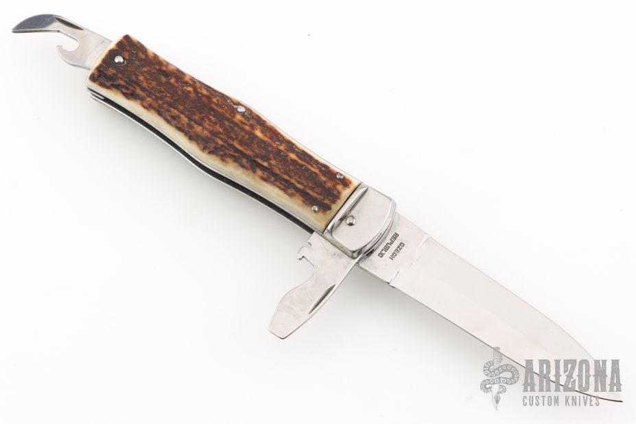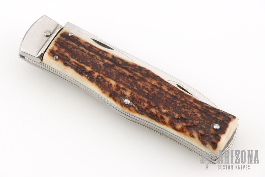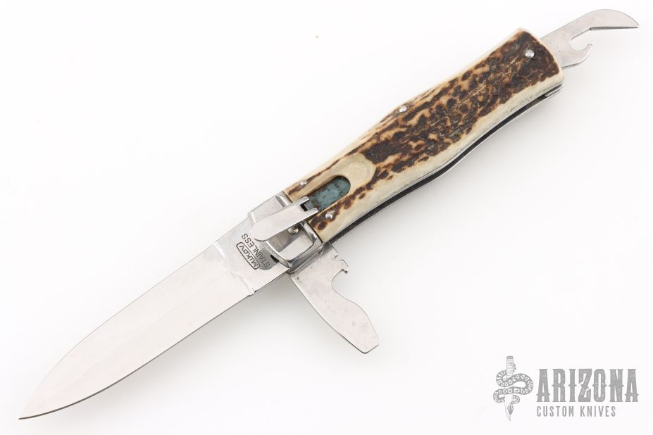 This lever auto from Mikov Knives has a mirror polished spear point blade with false top edge. The handle has stainless steel bolsters and liners, stag scales, stainless steel backspacer.  Has two bottle/can openers in the frame. Action is smooth and strong. Has a couple light scuffs, excellent condition otherwise.
