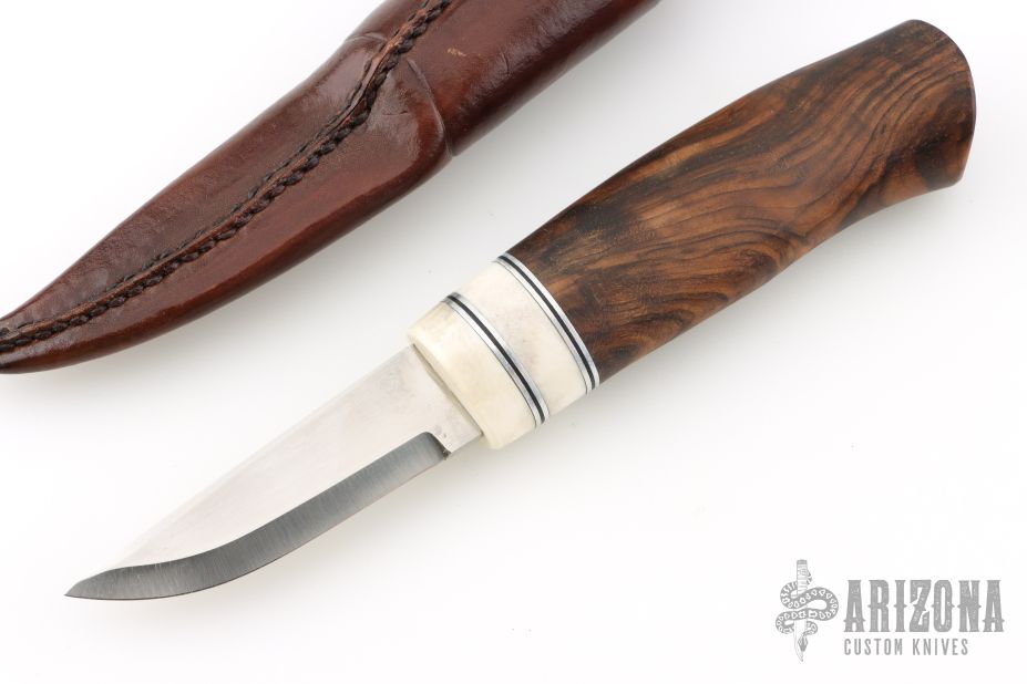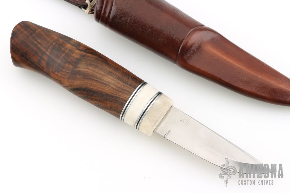 This Custom Puukko by Felix Wendt features a satin finished scandi ground blade made by Ingemar Nordell, .129" blade stock and .885" blade depth, hidden tang construction. The handle has a moose antler guard with aluminum and black spacers, and a walnut grip. Coems with a brown leather sheath. Has a couple very light scratches, otherwise excellent condition.