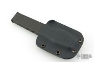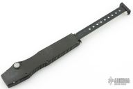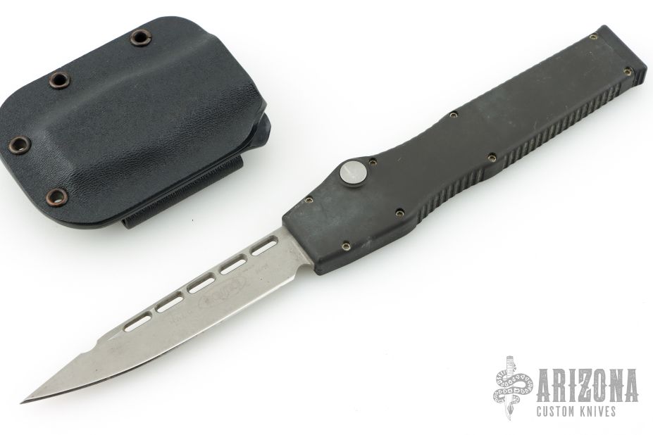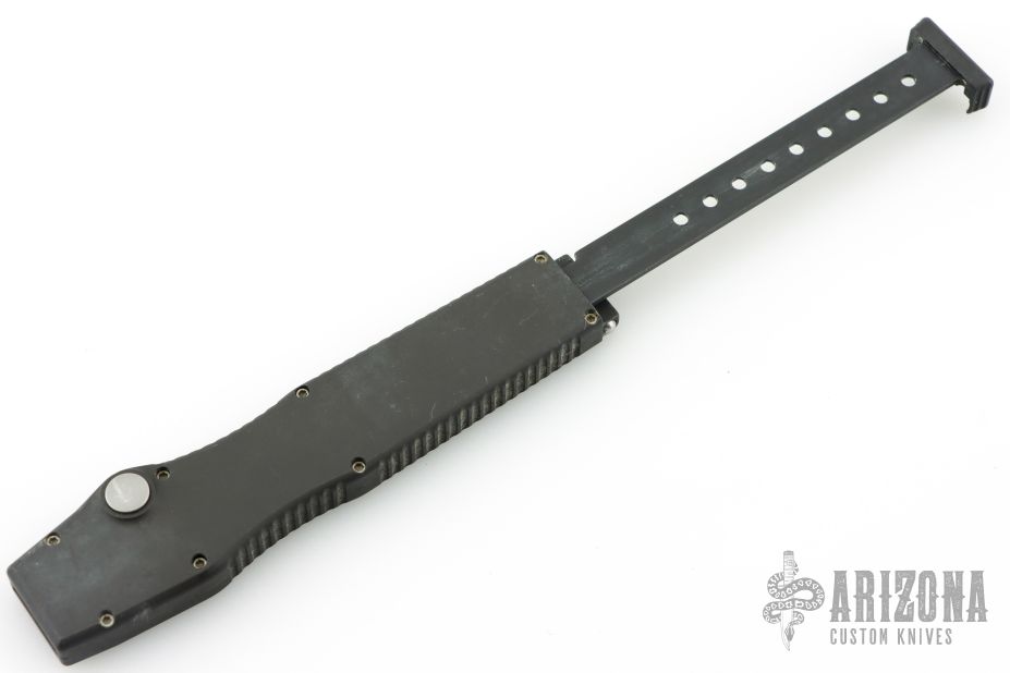 This HALO II is the clip point blade model in the HALO series by Microtech Knives. Single action, side positioned button for firing. Closure via a reverse charging handle in the rear of the frame. Contoured frame grip with milled ribbing on the frame spine and belly. This Halo II has a bead blasted clip point blade. Dated 04/98. Comes with original kydex belt sheath. Has scuffs and scratches throughout. Has a couple spots on the blade. Good condition otherwise.