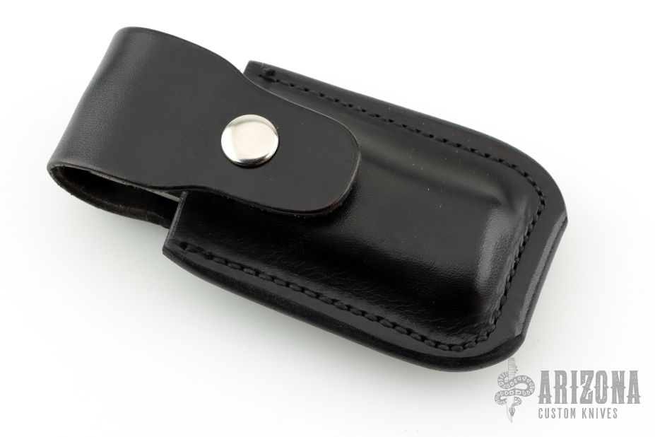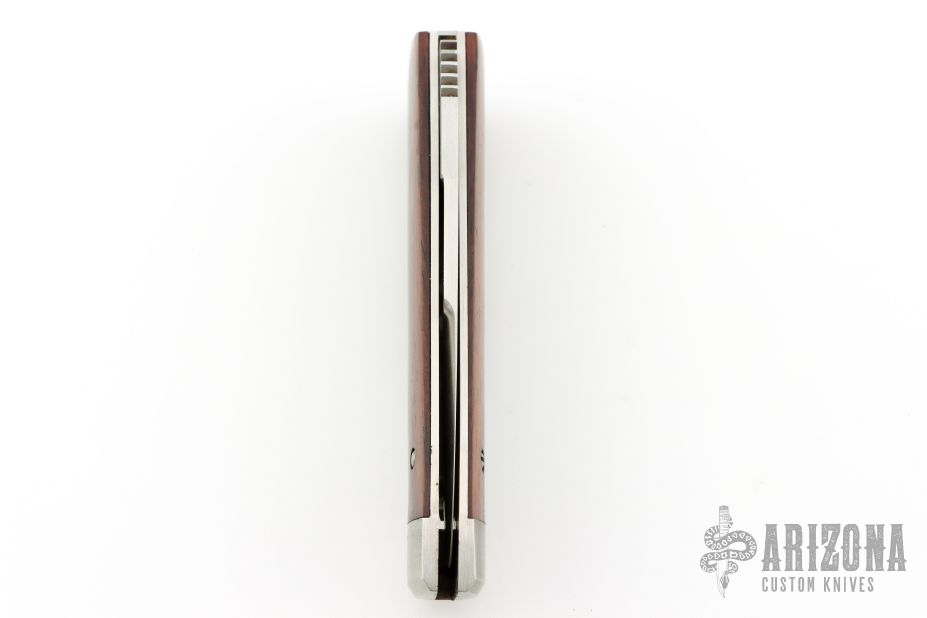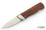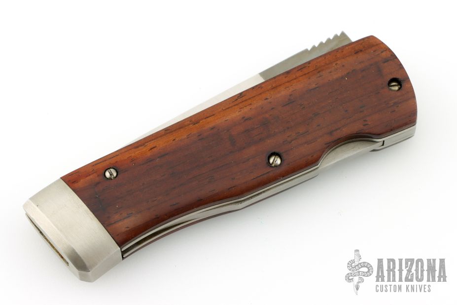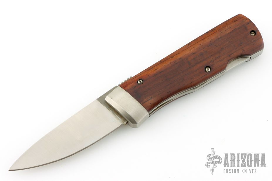 This Diamondback from Benchmark features a satin finished blade. The handle has a stainless steel frame with wood scales. Opening mechanism pushes blade up and out the front, then locks. Stainless steel liners and stainless steel bolster. Comes with original box, papers and black leather sheath. Excellent Condition.