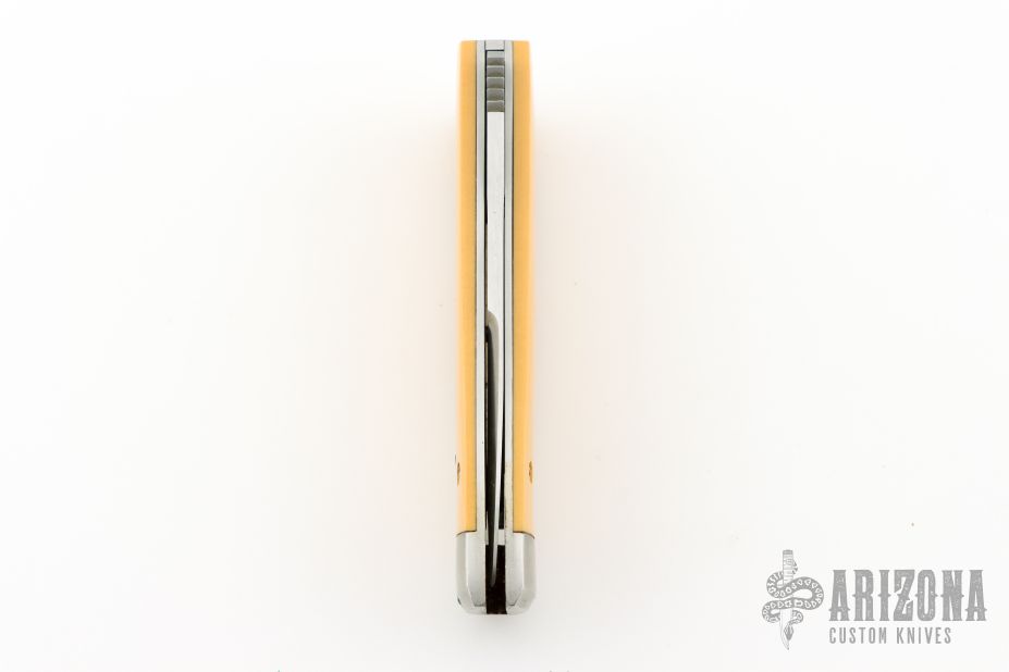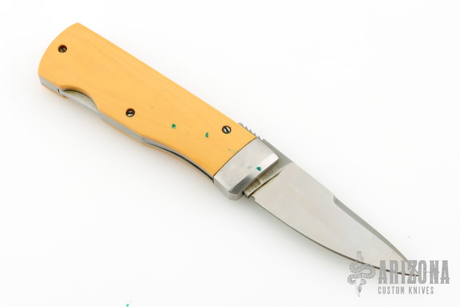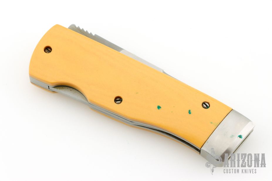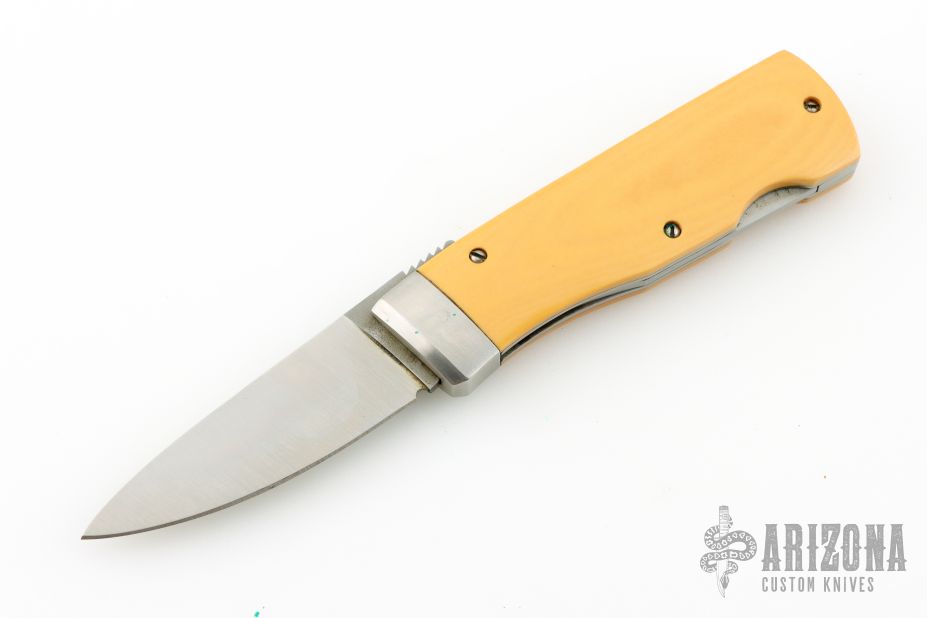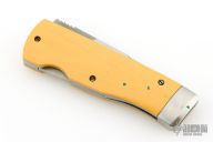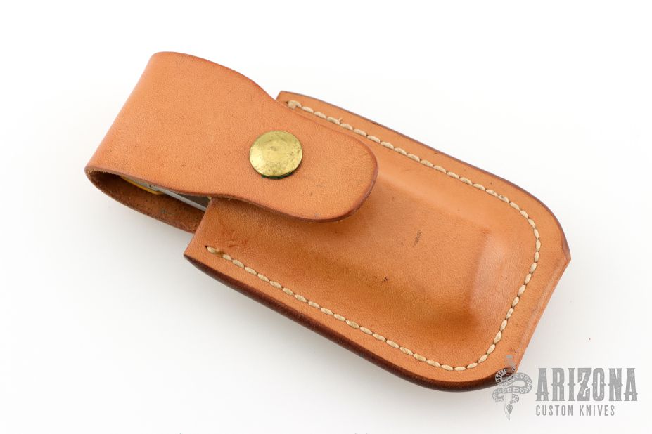 This Diamondback from Benchmark features a satin finished blade. The handle has a stainless steel frame with micarta scales. Opening mechanism pushes blade up and out the front, then locks. Stainless steel liners and stainless steel bolster. Comes with original box, papers and black leather sheath. Excellent Condition.