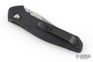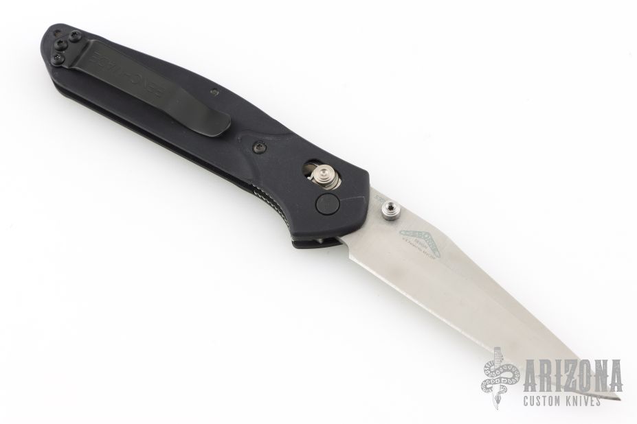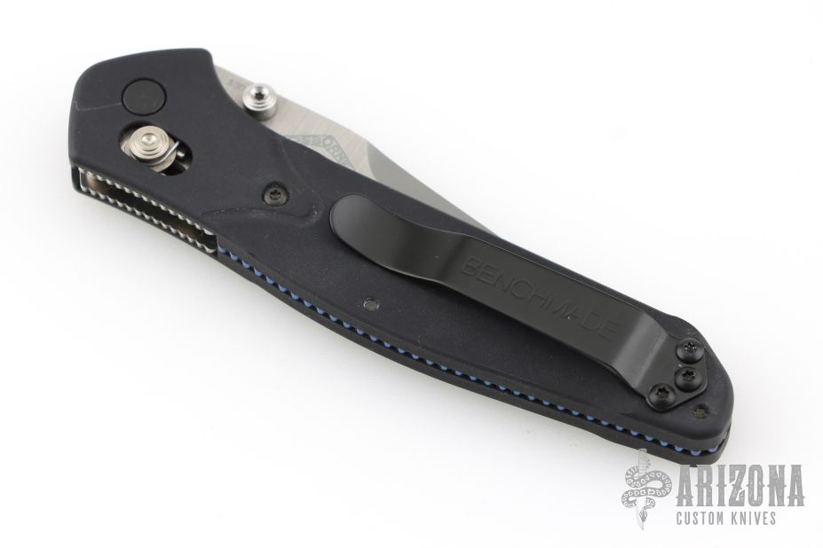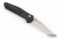 This Osborne designed Benchmade features a stonewashed plain edge blade, black aluminum handle, tip up reversible stainless steel clip. Axis lock mechanism. Comes with original box, papers and drawstring pouch. Includes the original box and papers. Excellent Condition.