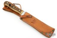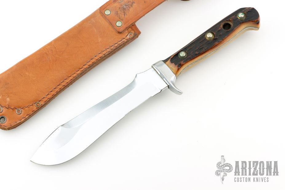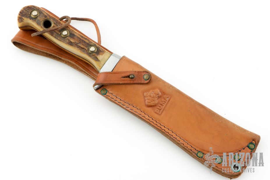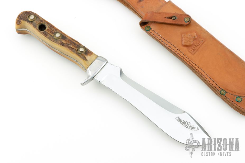 This White Hunter by Puma is the ultimate outdoorsman’s knife, originally designed by African professional hunters. It features a curved blade for cutting, slicing and skinning and a strong back edge for hacking. Handmade by skilled craftsmen with stag scales. 41371 on the guard, Your Puma knife was made in the 1st quarter of year 1973. Comes with original brown leather sheath and box. Has some scratches and scuffs. Great condition otherwise.
