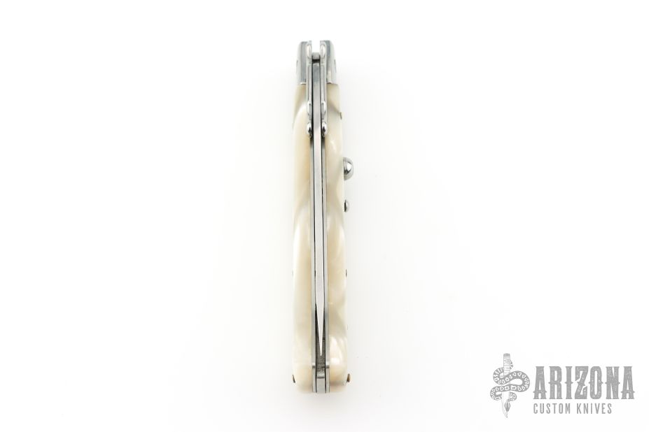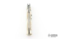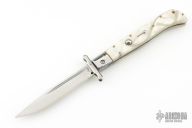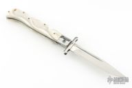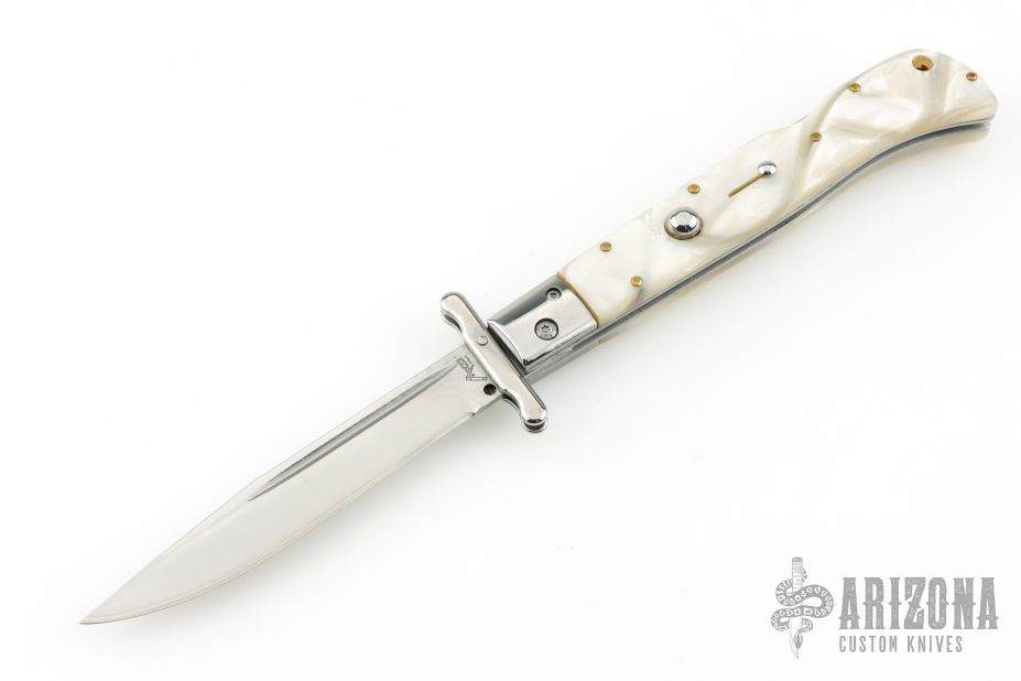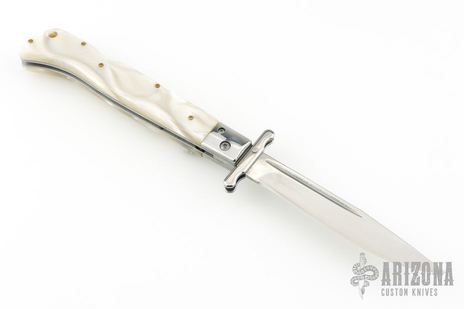 This Swing Guard Lockback Auto by AKC Italy has a polished stainless steel blade with fullers. The handle has pearlex scales with stainless steel liners, and stainless steel back spacer and lock.  Includes a leather sheath. Excellent Condition.