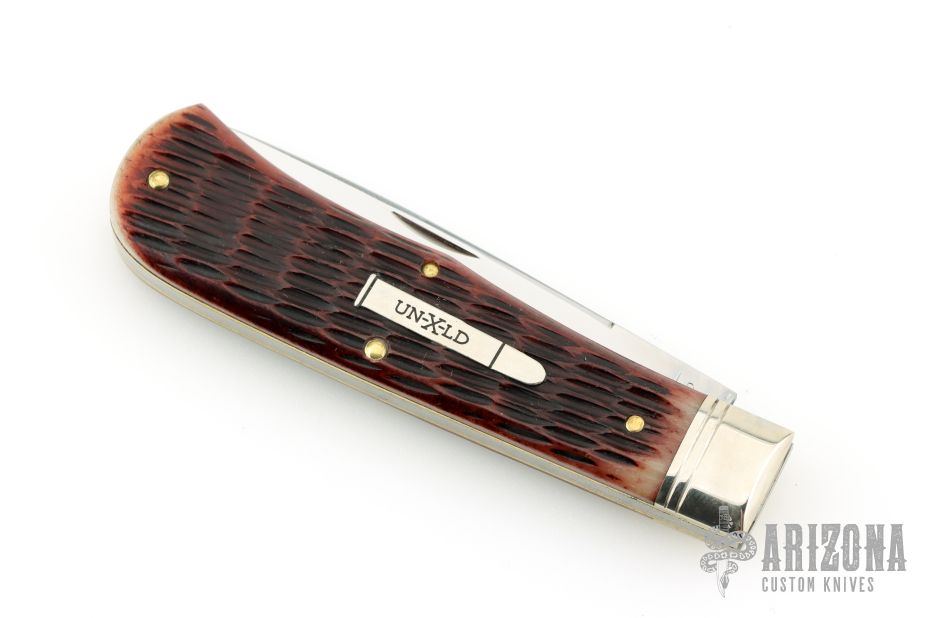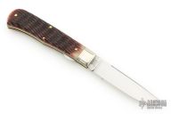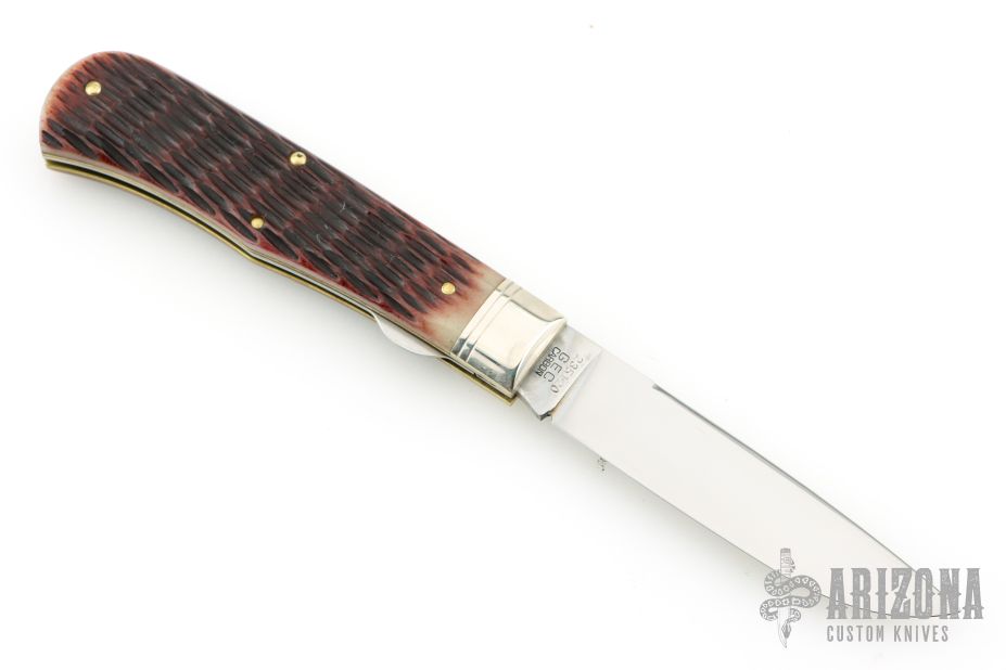 This Linerlock by Great Eastern Cutlery features a satin finished blade with nail nick. The handle has nickel silver bolsters, redtail jigged bone covers with nickel silver escutcheon, brass liners, stainless steel locking liner, and stainless steel spring. Comes with original tube. Excellent condition. 220 made