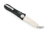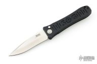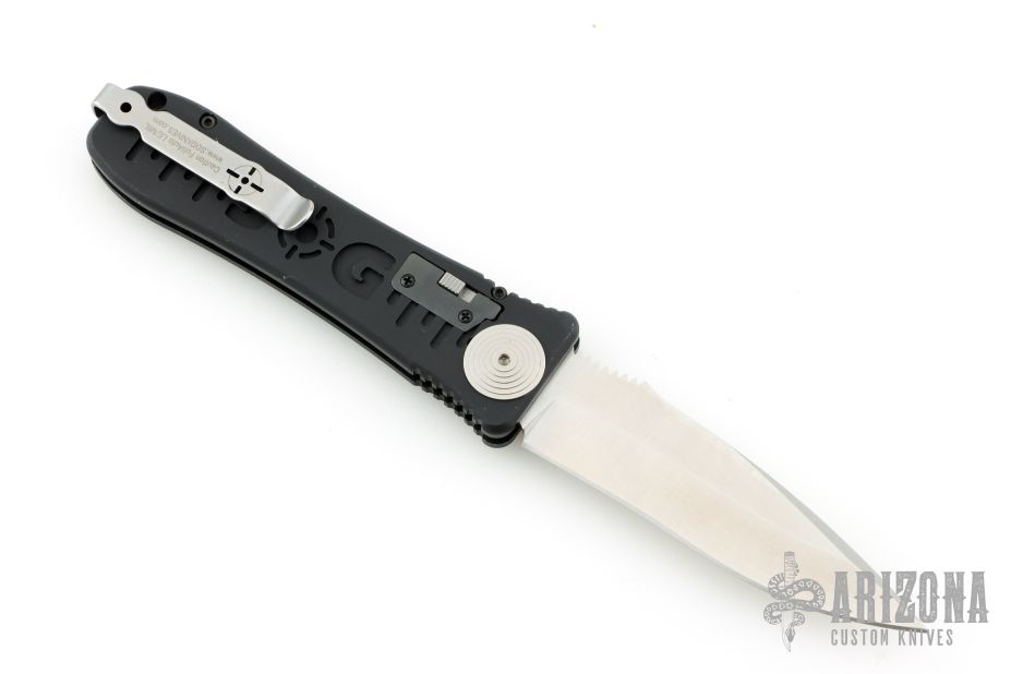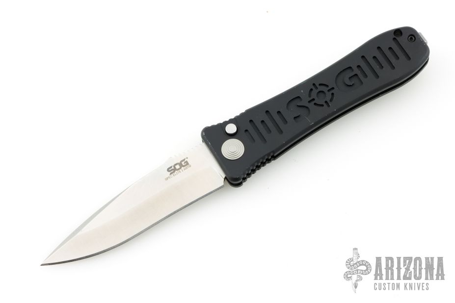 This Spec Elite I Auto by SOG features a satin finished recurve blade with notched thumbrest. The handle has a black aluminum frame with notched thumbrest. Has safety and tip up SS clip. Excellent condition. Has some scuffs and scratches, great condition otherwise.