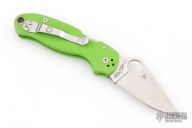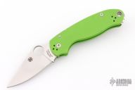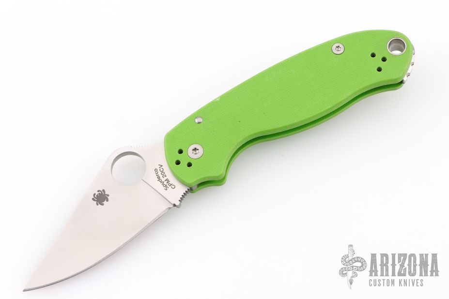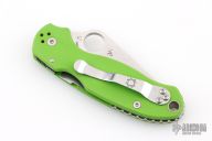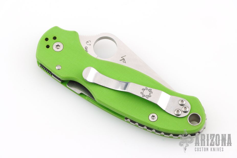 This Para 3 by Spyderco features a satin finished clip point blade with thumb hole and notched thumbrest. The handle has green G-10 scales over nested steel liners and stand-offs. Custom notched backspacer. The steel pocket clip is 4 way adjustable. Excellent condition.