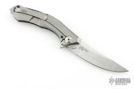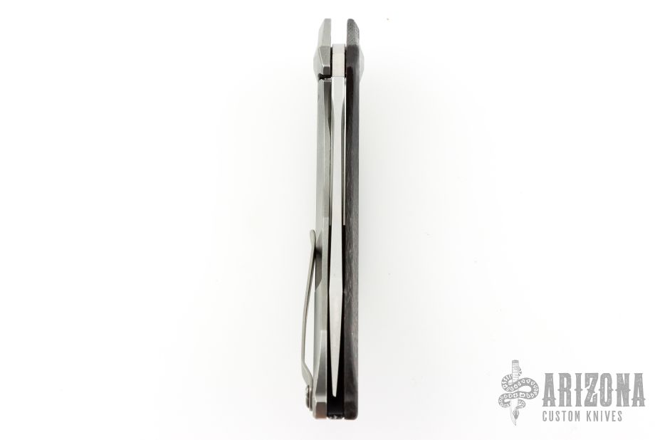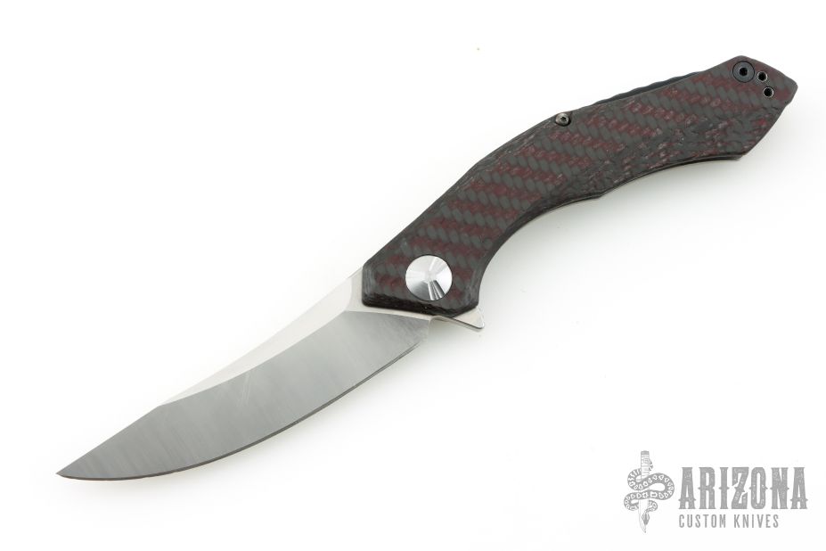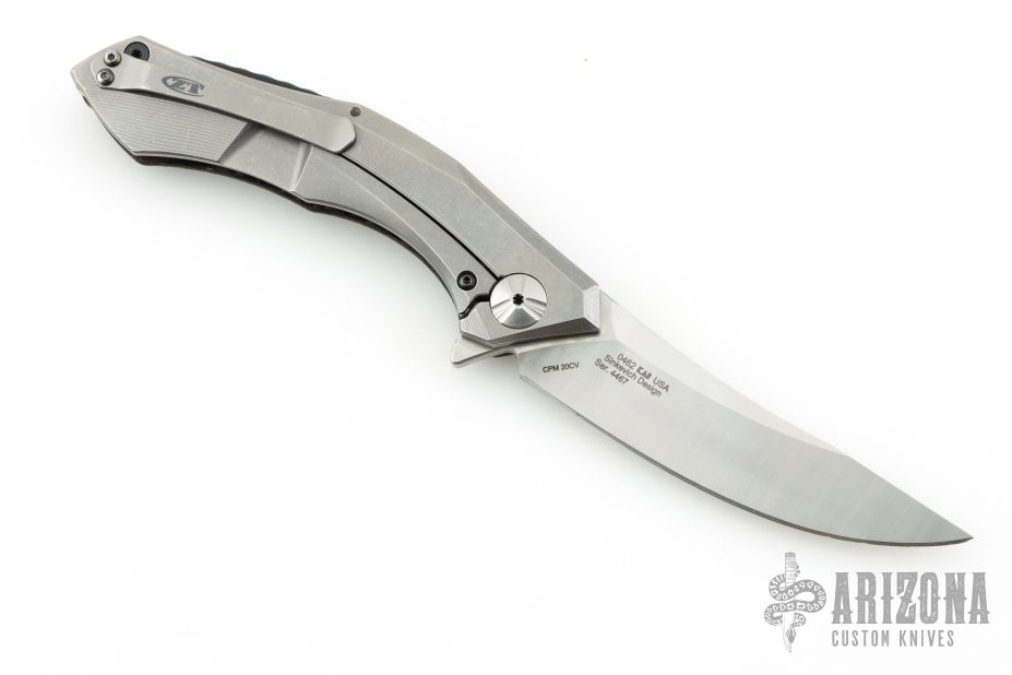 This 0462 Sinkevich Design flipper by Zero Tolerance features a satin finished upswept blade with flipper and swedge. The handle has a red/black carbon fiber and tumbled titanium frame, black aluminum backspacer and a tip up reversible titanium clip. Nice detent, lockup and blade seating, rides on bearings. Has stainless steel lockface insert and overtravel stop, ceramic detent ball. S/N 4467. Has some light scuffs and scratches, great condition otherwise.