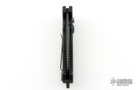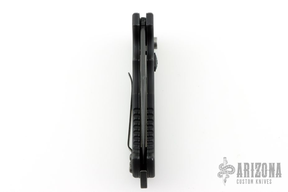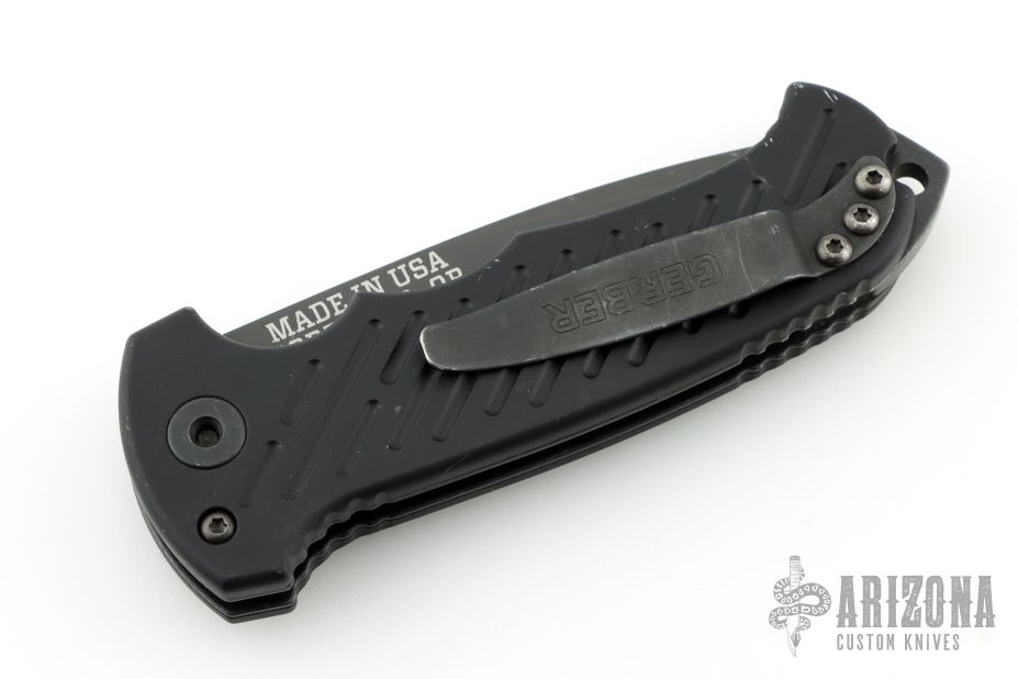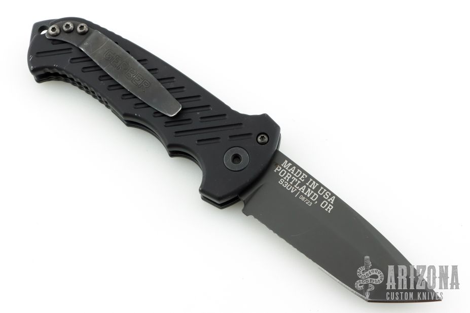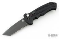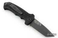 This 06 Side Opening Auto has a matte black finished S30V tanto partially serrated blade. Handle is black aluminum over black stainless steel liners, exposed stainless steel tang butt/ glass breaker/ backspacer with lanyard hole, black stainless steel tip up (RH/LH reversible) clip, and safety button. Has some light scuffs and scratches, great condition otherwise.