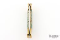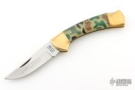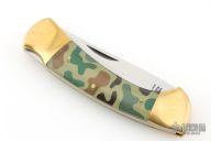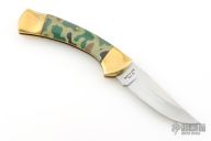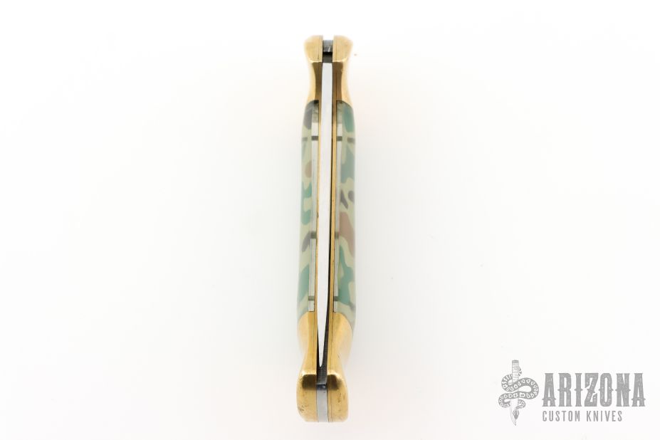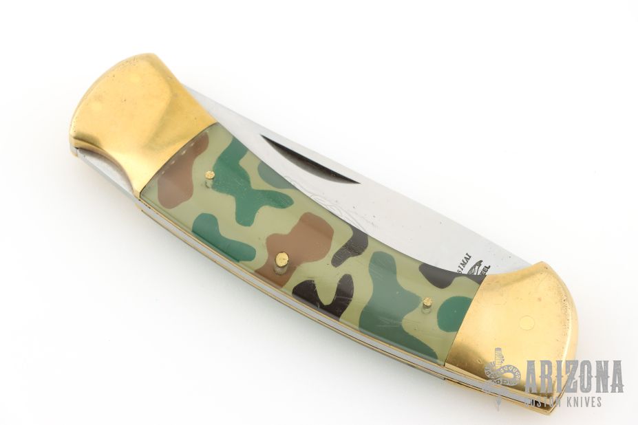 This lockback Parker-Imai features a satin finished clip point blade with nail nick. The handle is comprised of brass caps and bolsters with camo-acrylic covers over brass liners and steel spring. Has scuffs, scratches, and patina. Good condition for its age.