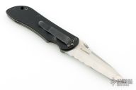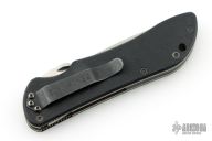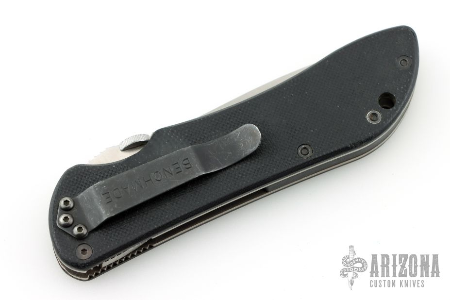 This Stryker by Benchmade has a satin finished partially serrated tanto blade. The handle features black G10 scales over titanium liners, stainless steel clip, tip down carry. Has scuffs and scratches, great condition otherwise.