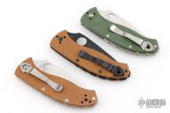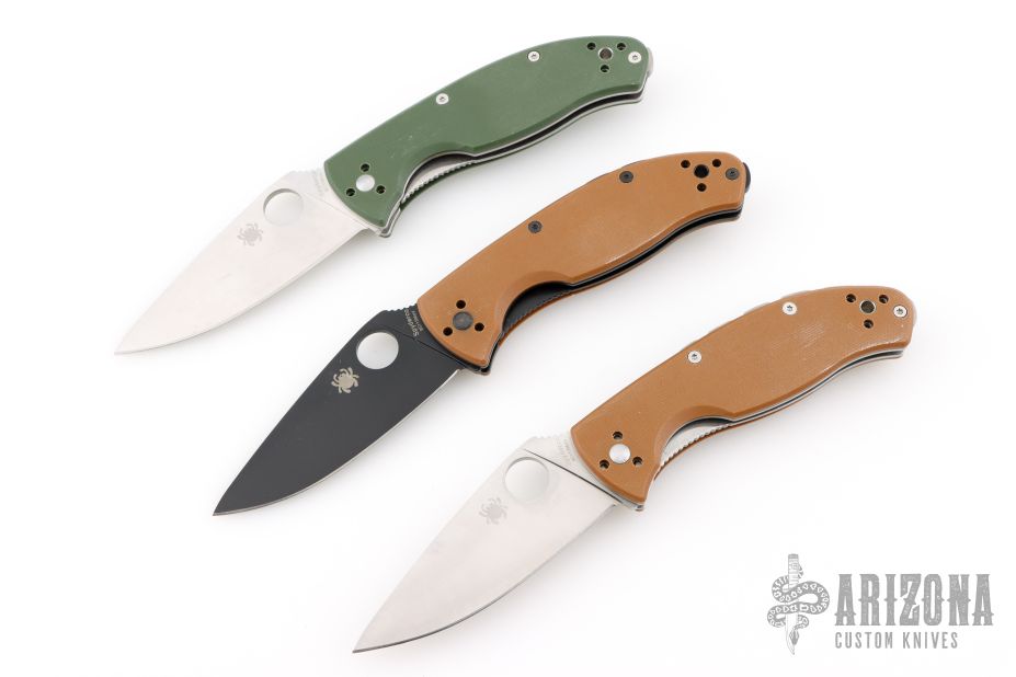 Lot of 3 Spyderco Tenacious Folders. They all have custom backspacers. They have some scuffs and scratches, otherwise good condition.