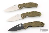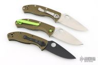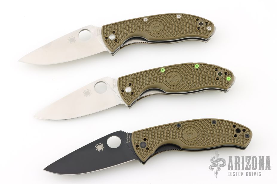 Lot of 3 Spyderco Tenacious Folders. 2 have custom backspacers. One has custom neon green hardware. They have FRN scales. They have some scuffs and scratches, otherwise good condition.