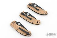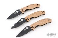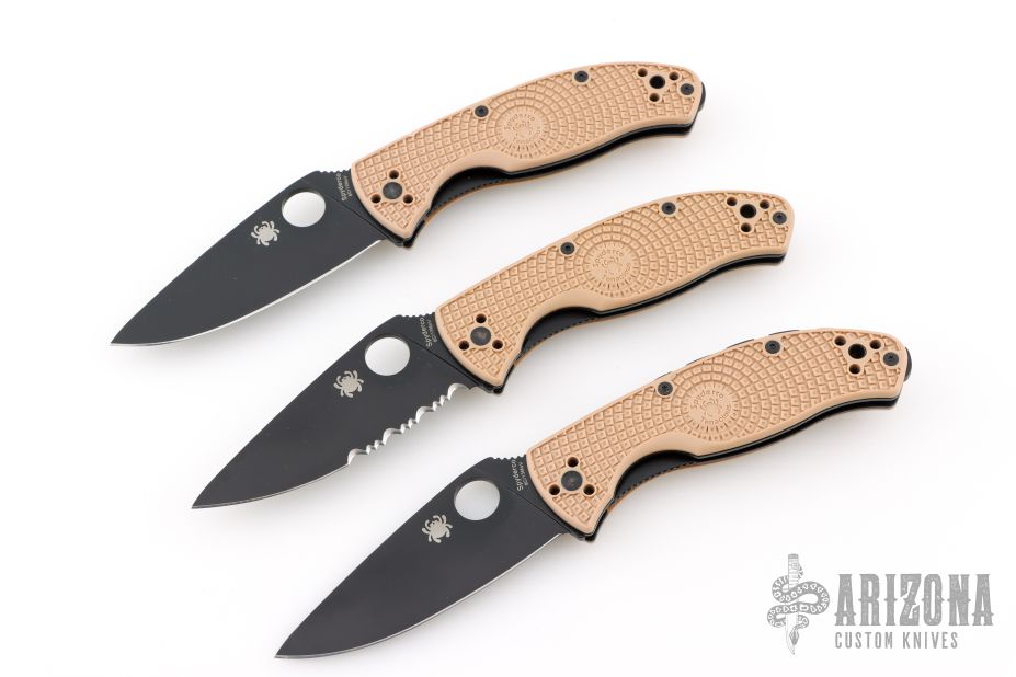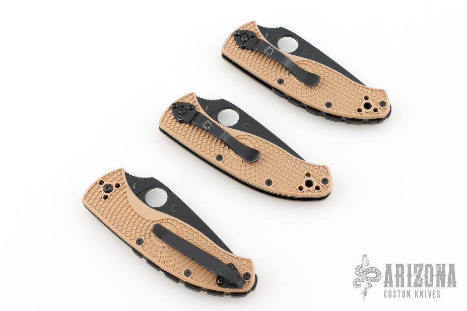 Lot of 3 Spyderco Tenacious Folders. 2 have custom backspacers. They have FRN scales. They have some scuffs and scratches, otherwise good condition.