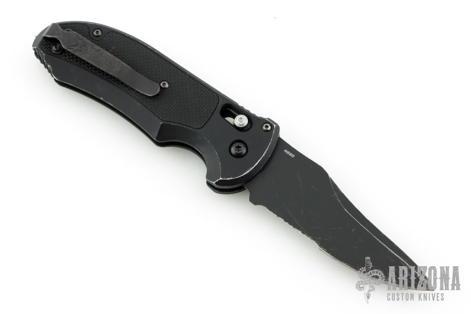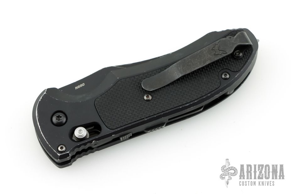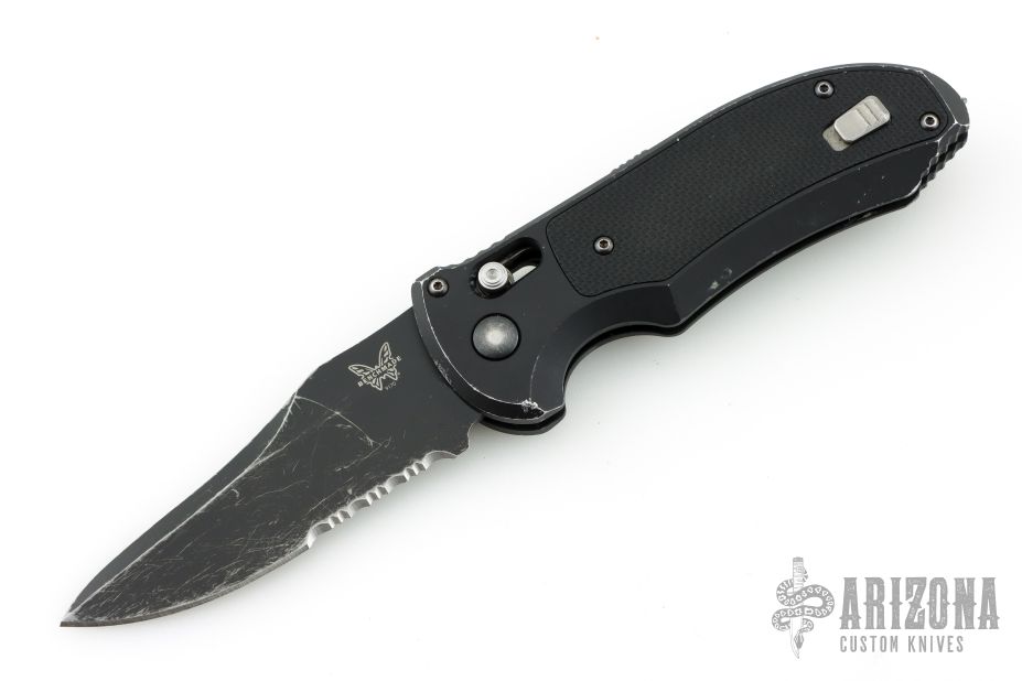 Comes in a Benchmade drawstring pouch. Has scuffs and scratches throughout. Good condition otherwise.
