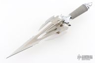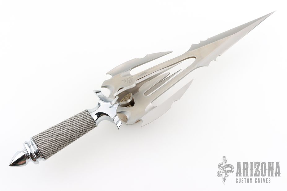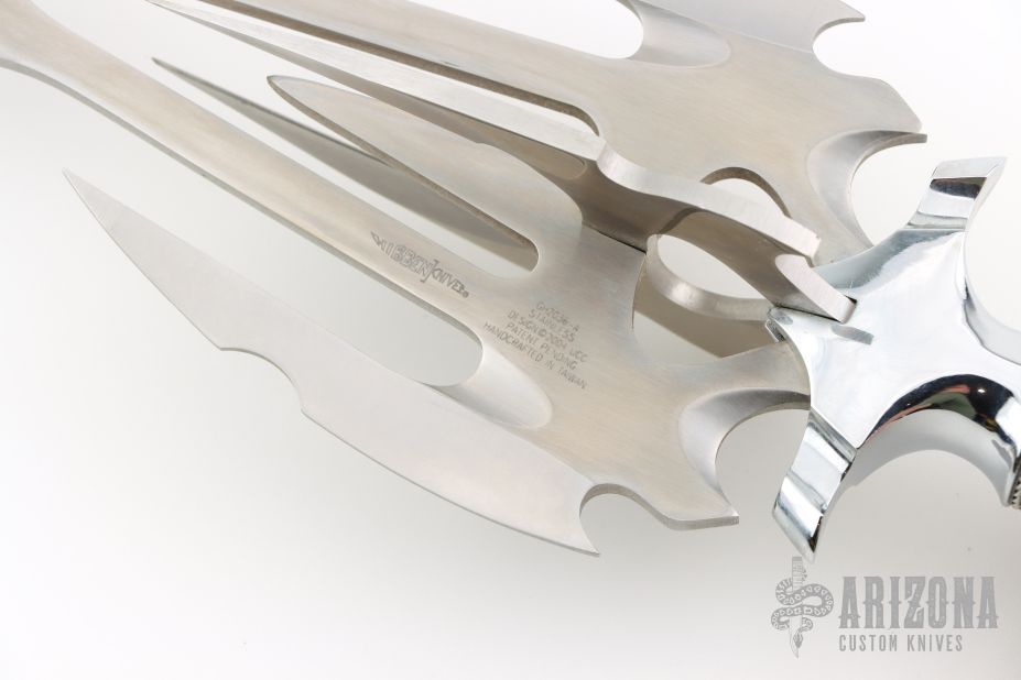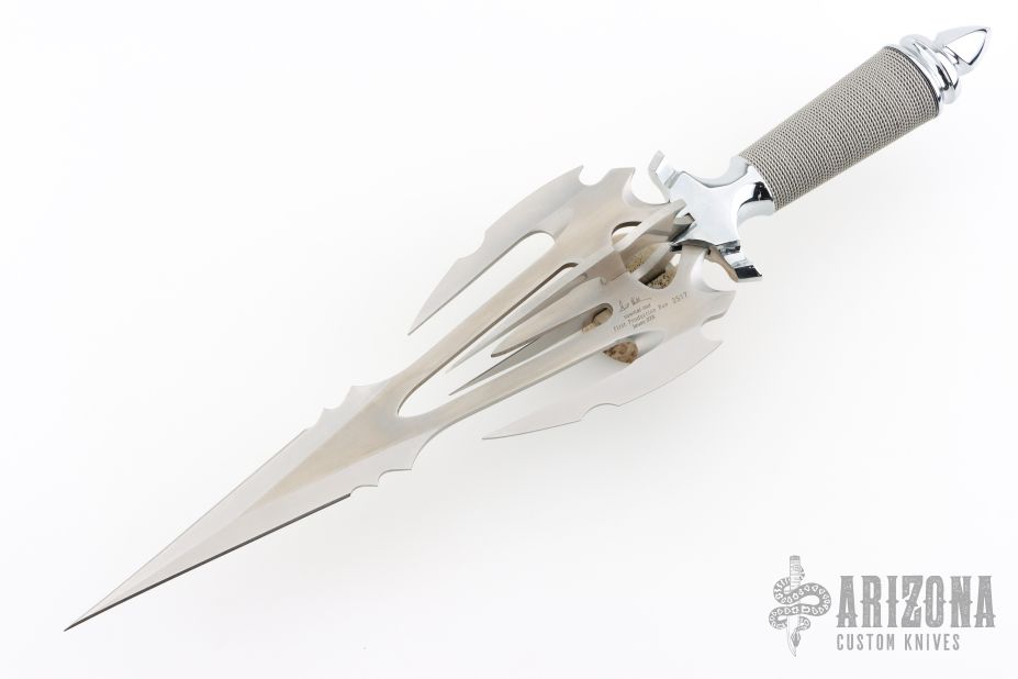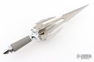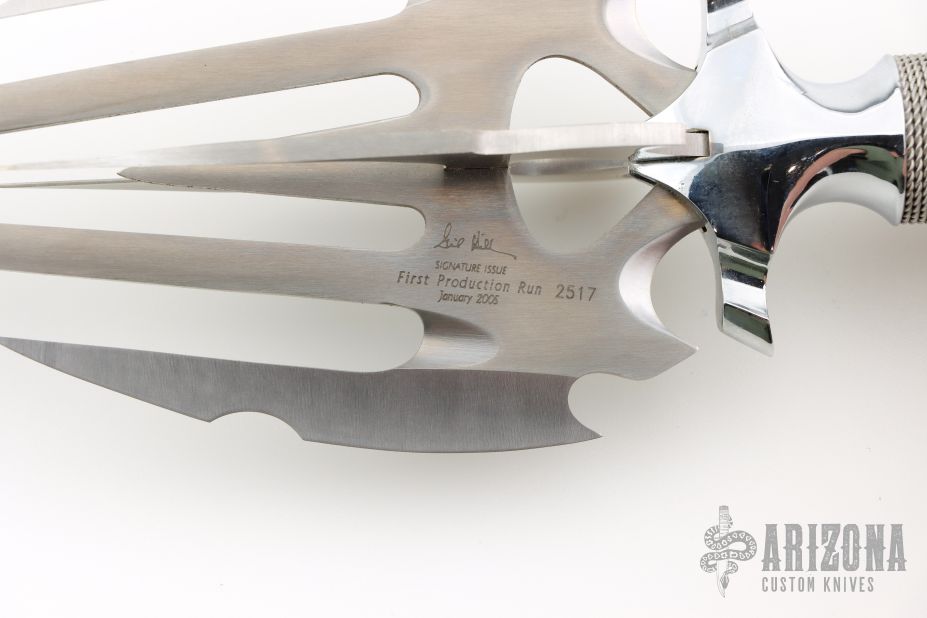 The Titan by United Cutlery is a Gill Hibben design from the Hibben Annual Fantasy Collection from 2005. This one is a Signature Issue and First Production Run January 2005 and is #2517 of 3000. Satin finished double edged blade with 4.5" sharpened edges, .190" blade stock and 3.765" blade depth near the guard, hidden tang construction. The handle is polished stainless steel with twisted wire inlay. Excellent condition.