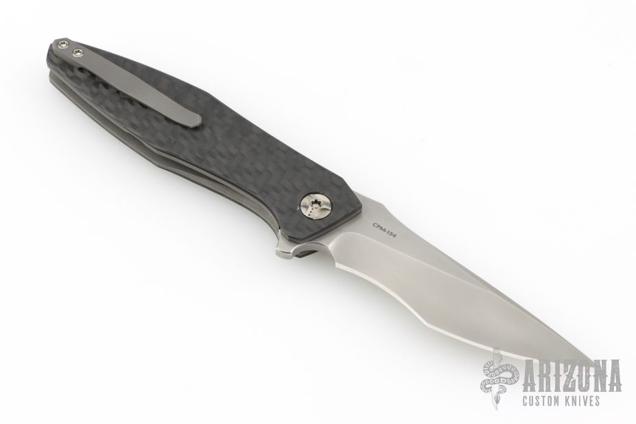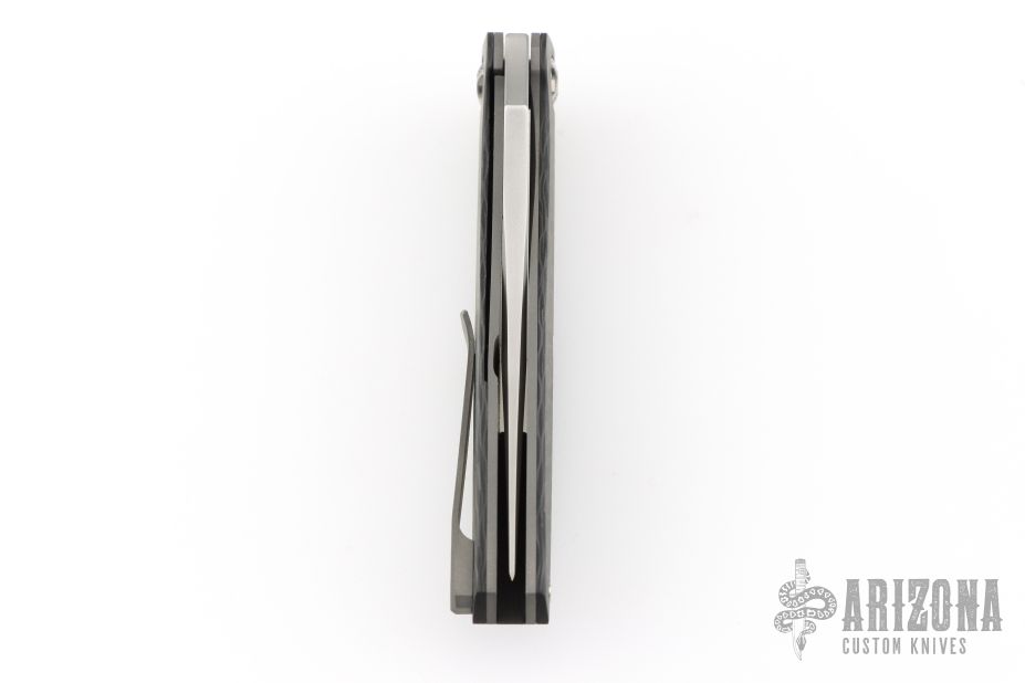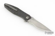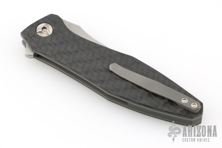 This Primo Linerlock flipper by Alex Hossom features a matte finished blade with flipper. The handle has carbon fiber scales, titanium liners, carbon fiber backspacer, titanium hardware and tip up clip. Comes with a zippered case. Rides on bearings, nice detent, lockup and blade seating. Excellent Condition.
