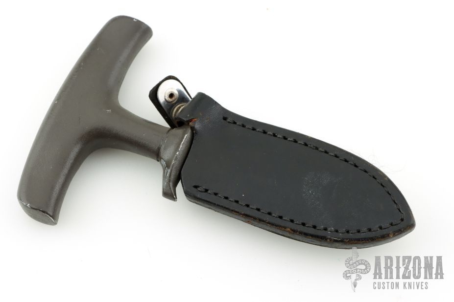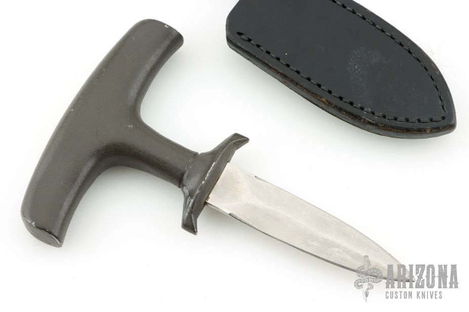 This Push Dagger by Compass features a double edged blade with .156" blade stock and .759" blade depth, hidden tang construction. The handle has a coated metal handle. Comes with original leather sheath. Has some scuffs and scratches, good condition otherwise.