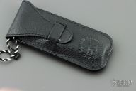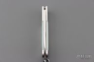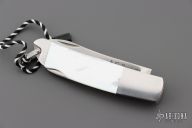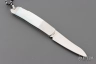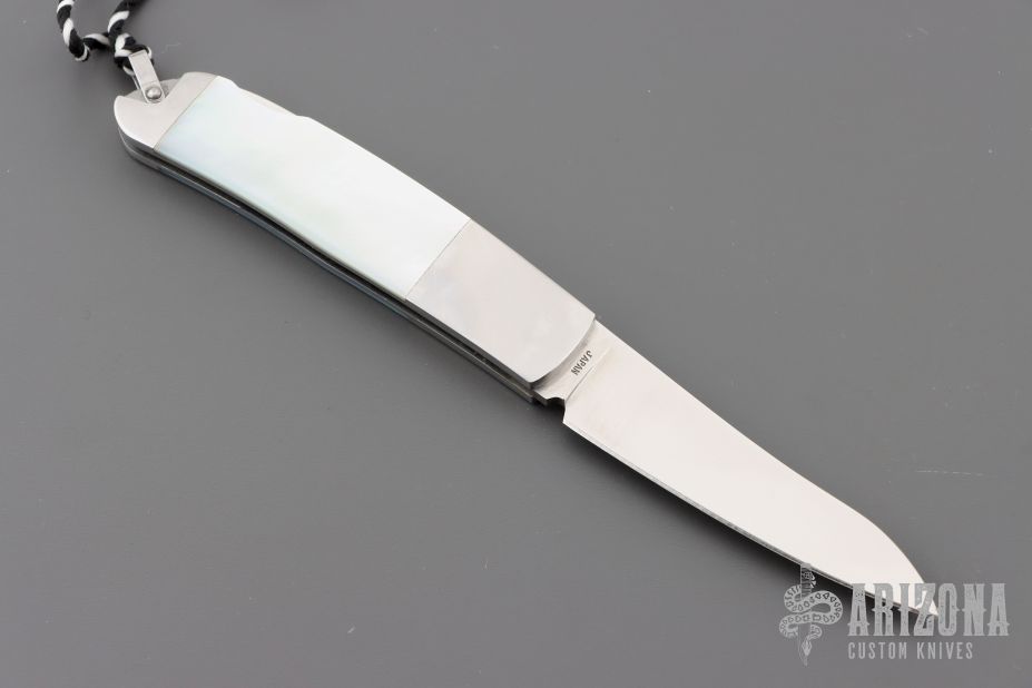 This Lockback by AG Russell features a satin finished blade with a single nail nick. The handle has steel bolsters, liners and back spring. Mother-of-pearl scales. Includes a black leather sheath. Excellent Condition.