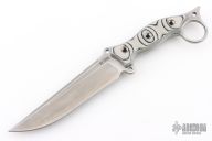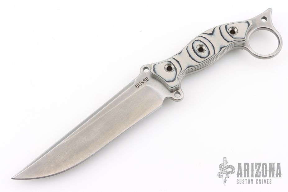 This Boarracuda Fighter by Busse features a competition finished blade with false top edge, .213" blade stock and 1.475" blade depth, full tang construction. The handle has black/tan G-10 scales with extended tang and lanyard hole. New from maker!