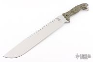 This Moab by Busse Custom Shop features a clip point satin finished blade with sawteeth on the spine, .340" blade stock and 2.296" blade depth, full tang construction. The handle has black/green G-10 scales and an extended tang with lanyard holes. New from maker!