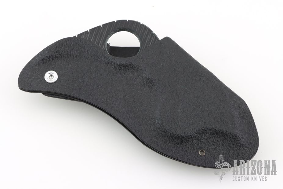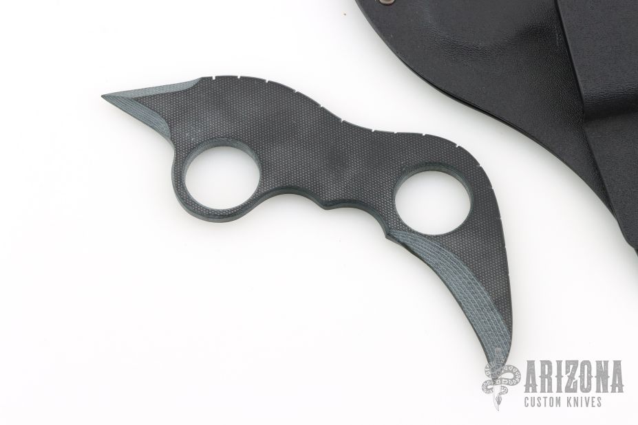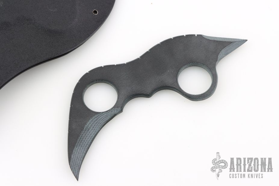 This Military Kerambit by Laci Szabo is made from black G-10 that is .241" blade stock and 1.572" blade depth, full tang construction. Comes with kydex sheath. Excellent condition. This knife is sterile and non-magnetic.