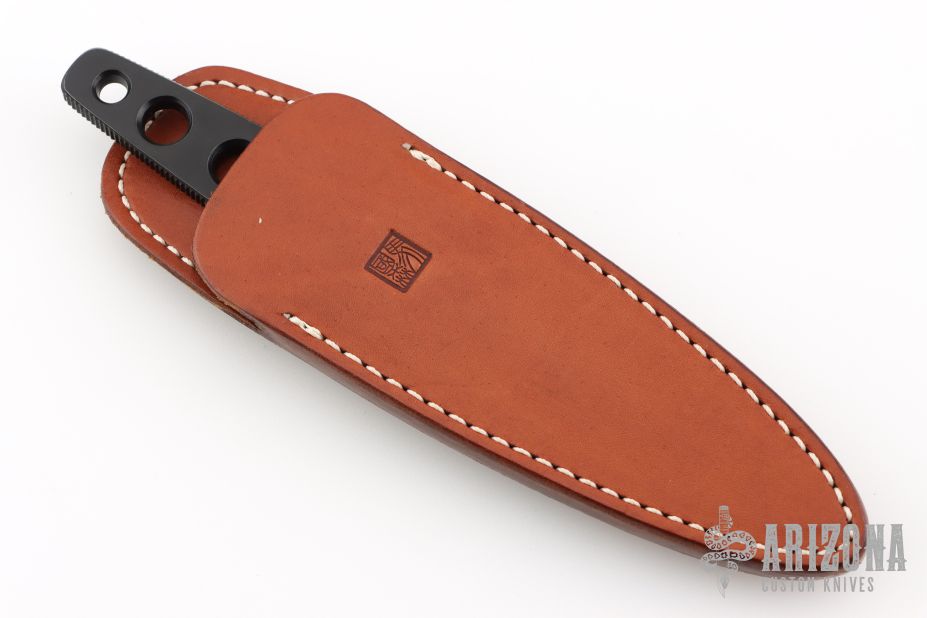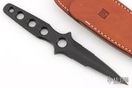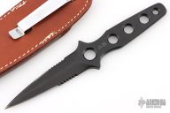 This Boot Knife from Al Mar Knifes features a spear point dual edge blade with partial serrations on each side. The handle has skeletonized stainless steel with notches down the length of the handle for grip. Includes leather sheath with stainless steel pocket clip.  Includes original packaging.  Excellent condition.