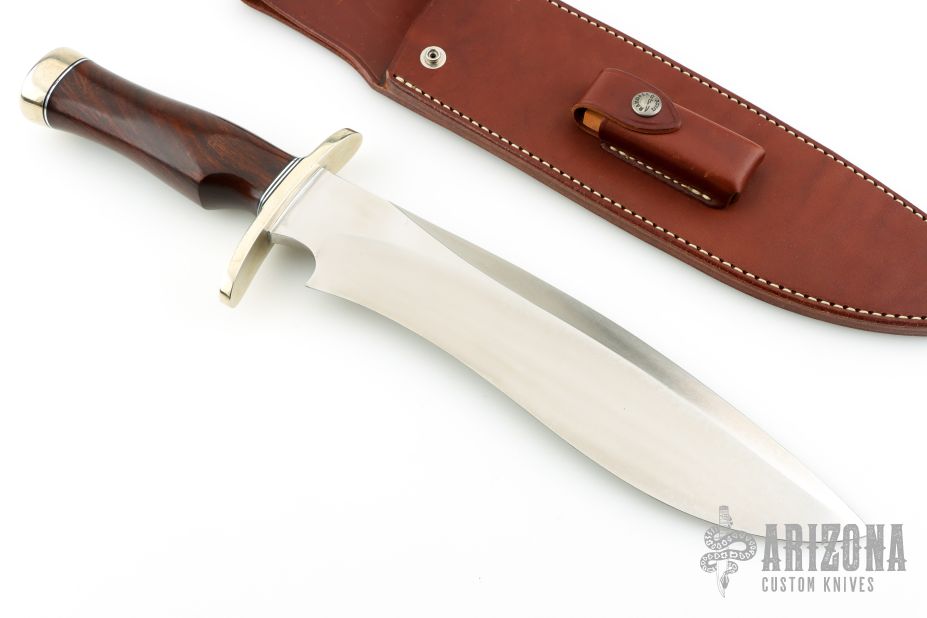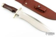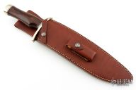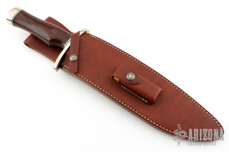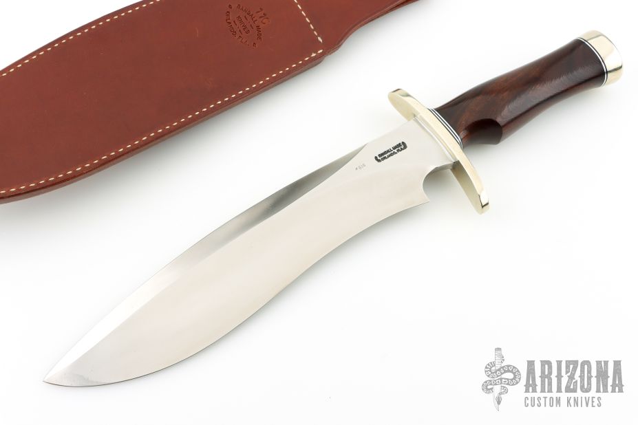 This Sasquatch by Randall Made Knives features a satin finished recurve blade with sharpened top edge, .320" blade stock and 2.257" blade depth, hidden tang construction. The handle has a forward curved nickel silver guard and butt, desert ironwood single finger grip with black and duralumin spacers. Comes with a brown leather sheath. #614 on the blade. Excellent condition.
