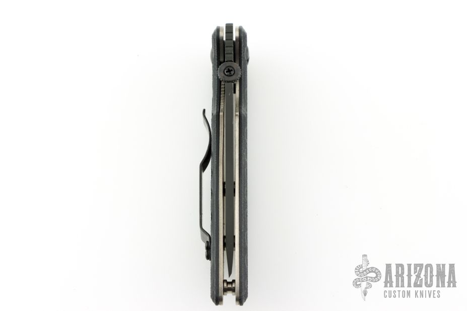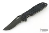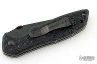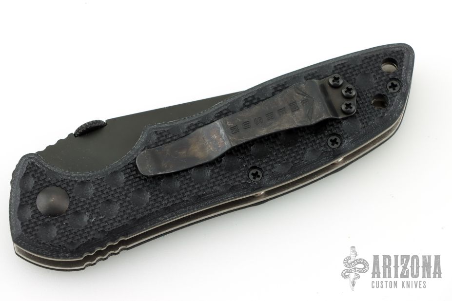 This Mach-1 BT - 2000 Vintage by Emerson Knives has a black blade with thumb disc, partial serrations, and notched thumbrest. Handle has dimpled black G-10 scales with titanium liners, standoffs, lanyard hole and tip up black stainless steel clip. Nice detent, lockup and blade seating. Comes with original box and papers. Has some scratches on the clip, excellent condition otherwise.