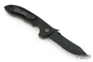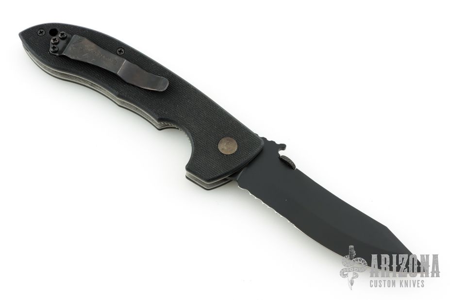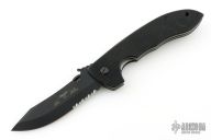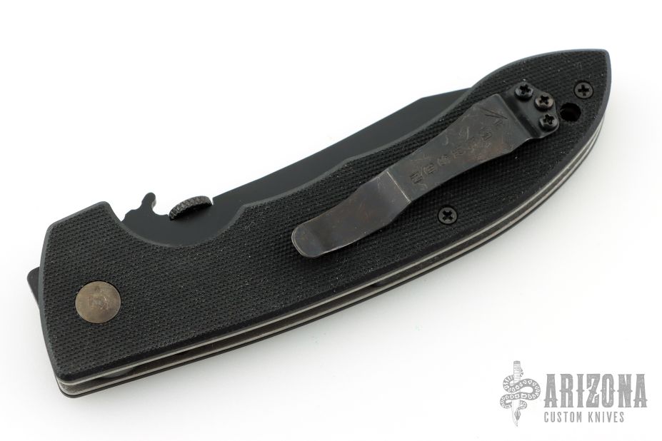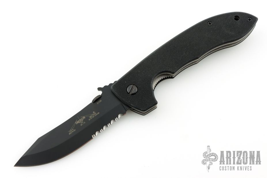 This CQC-8 by Emerson Knives features a black coated partially serrated edged blade with thumb disc and wave feature. Black G-10 epoxy/glass laminate scales over titanium liners and posts. Black stainless steel tip up clip. Comes with original box and papers. Has some light scratches on the clip, otherwise excellent condition.