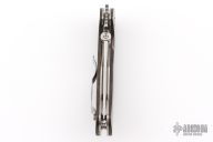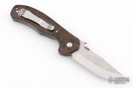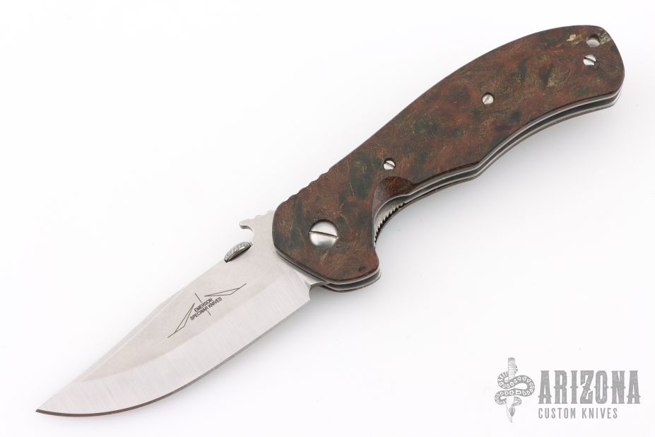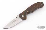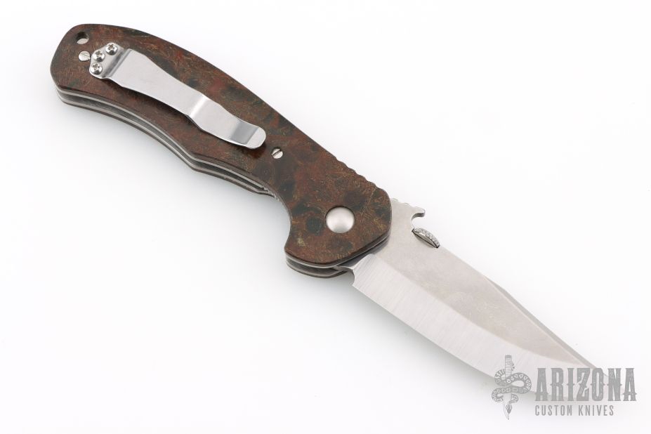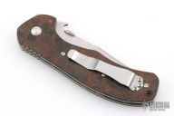 This Emerson Defender has a stonewashed hand ground blade with swedge, thumbdisc, wave feature and notched thumbrest. The handle has custom vintage rag micarta scales by Andrew Charlet, titanium liners, stainless steel clip. Signed by Ernest Emerson on the blade. Includes the original box and Whiskey Barrel wood scales. Excellent Condition.