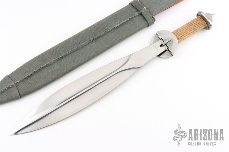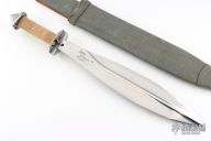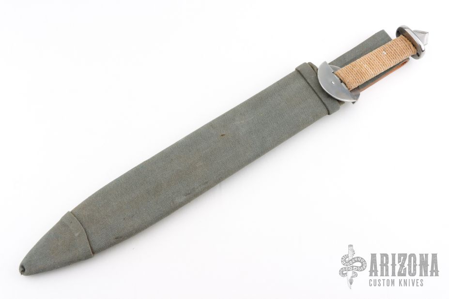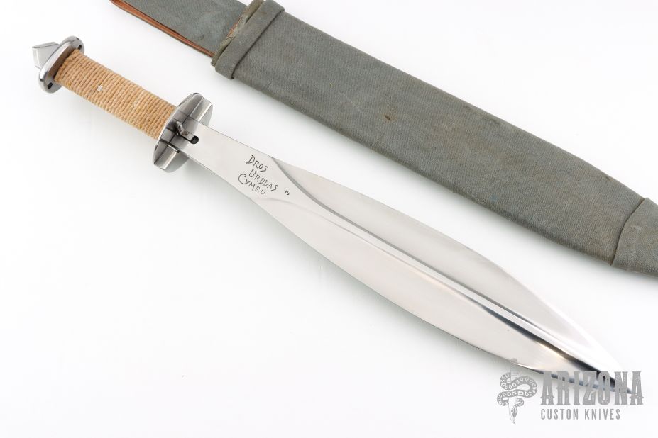 Made famous by The Royal Welsh Fusiliers and their fierce, brutal style of hand-to-hand fighting during the Battle of Messines Ridge in 1917. Meticulously replicated from an original of tough high carbon, tempered steel w/cord wrap grip. The folding circular cross guard works and the crusher pommel is nasty. It’s easy to see why this weapon was so effective in the right hands. Etched on one side of the blade is DROS URDDAS CYMRU, which translates – “For The Dignity of Wales”. Complete with heavy leather sheath covered in green canvas. Based on an ancient Celtic design it’s been extremely effective for hundreds of years. Made by Windlass Steelcrafts. Has a few light scratches, and a little oxidation on the guard, most of which i removed, otherwise excellent condition.