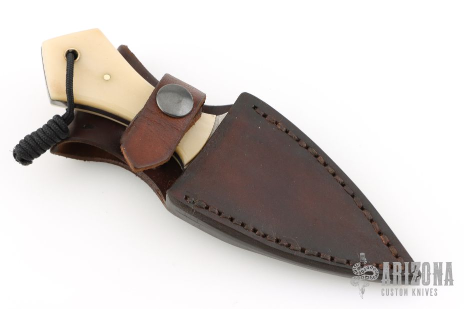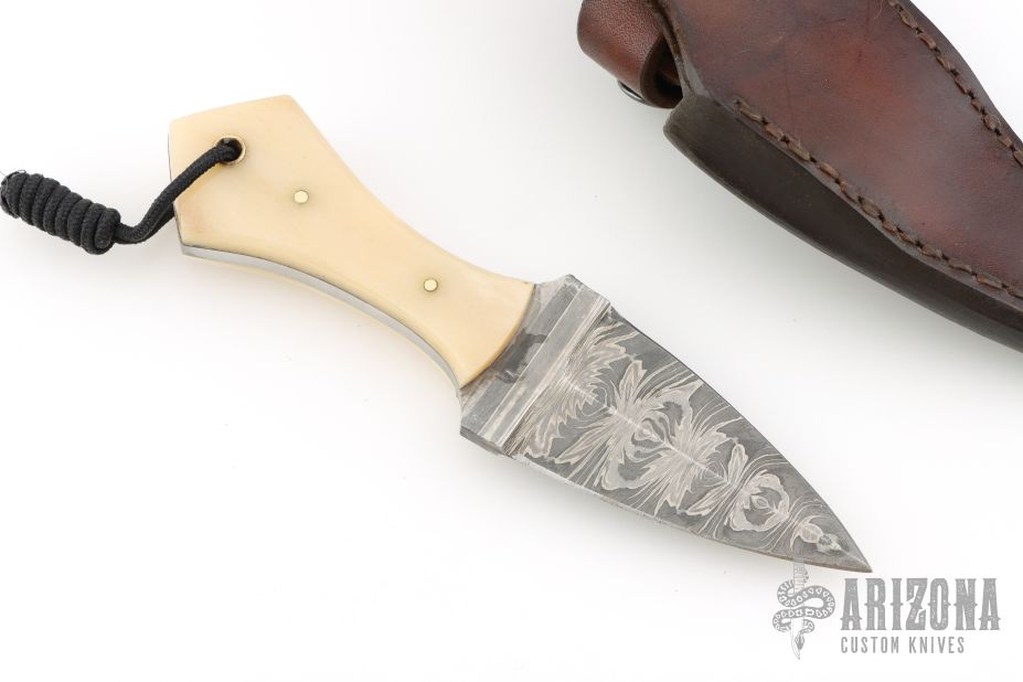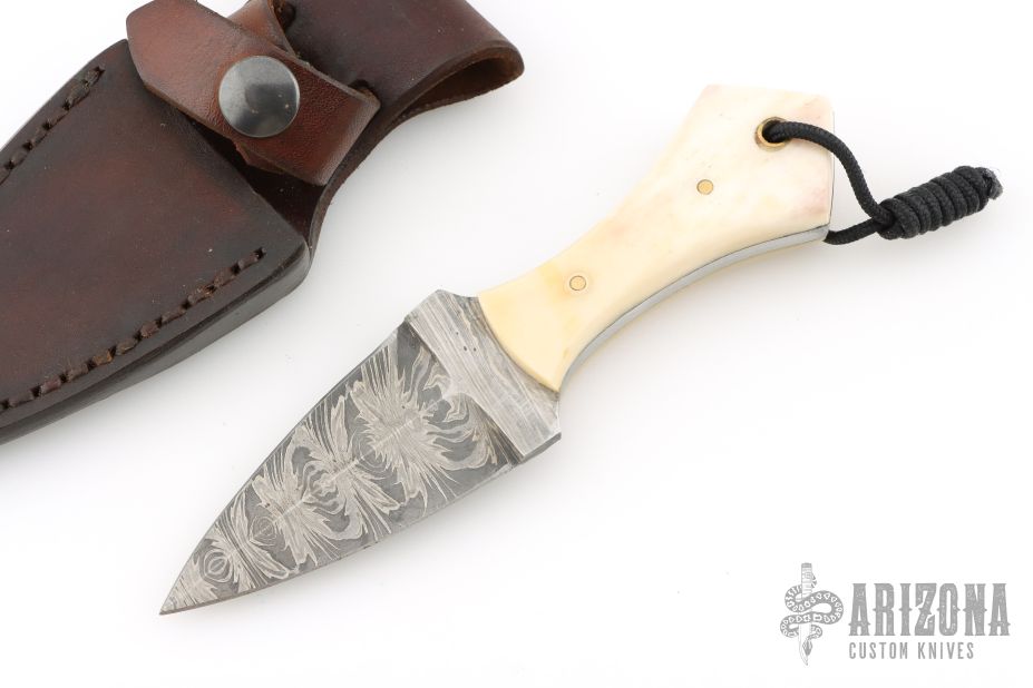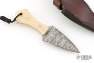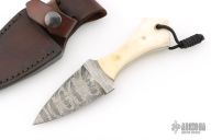 This Dagger by Jim Ort features a Damascus double edged blade with .177" blade stock and 1.475" blade depth, full tang construction. The handle has bone scales, brass pins, and lanyard hole in pommel. Comes with a brown leather belt sheath. New from maker!