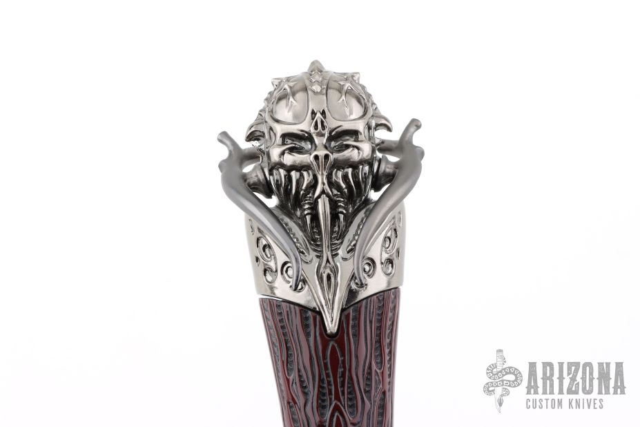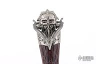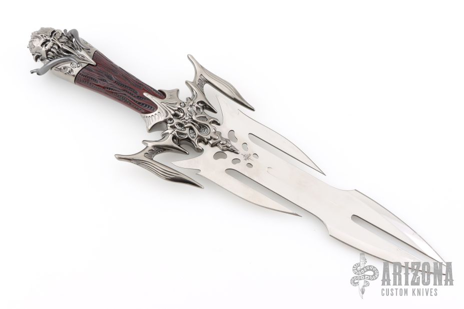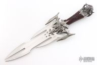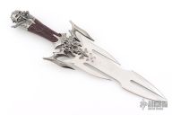 The Vintage KIT RAE KR10 UMETHAR TALISMAN OF THE ANATH Split Dagger is a collectible fixed blade knife manufactured by United Cutlery. This unique and ancient-looking dagger features a stainless steel blade with a silver color, measuring over 5 inches in length. The blade edge is designed for precision and utility, making it a versatile and valuable addition to any collection of knives, swords, and blades. Excellent condition.