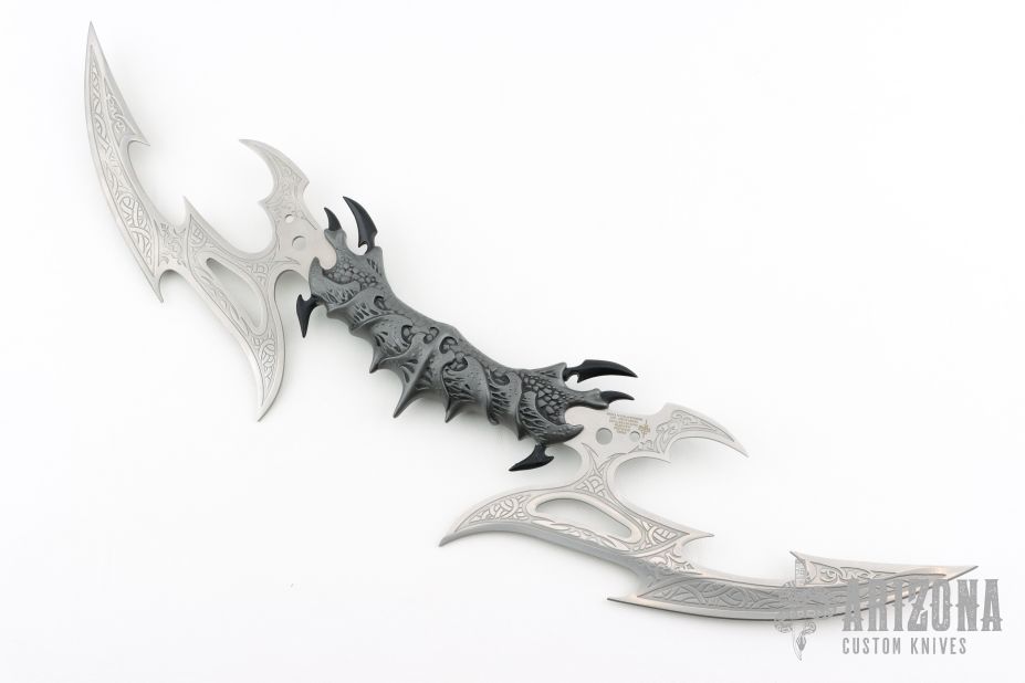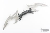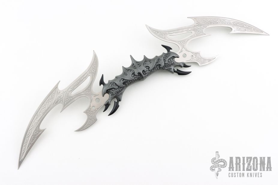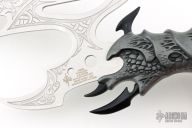 A special deep-etched edition of the very popular Valdris, designed by fantasy artist Kit Rae. Features include a highly detailed cast aluminum handle with a weathered metal finish and the tempered 420 stainless steel blades are deep-etched. Each piece is branded with the designer's trademark