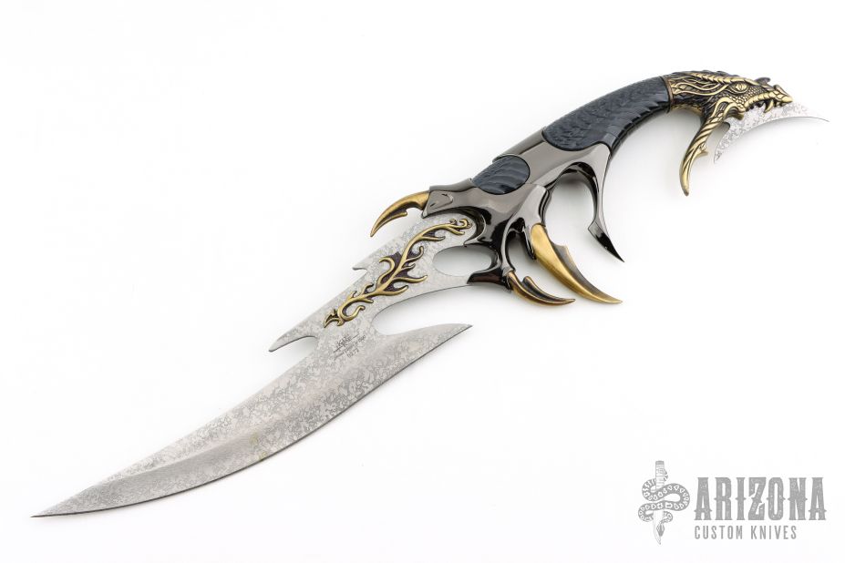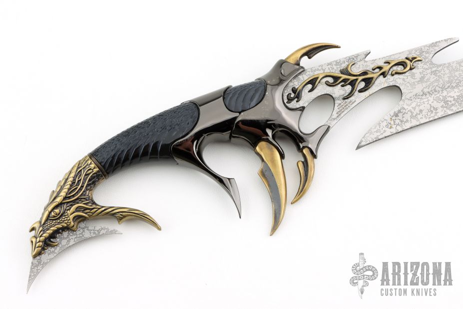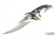 This collectible is the 3rd annual knife in the Kit Rae® Fantasy Art Collection. Archeros™ is one of the Blades of Chaos, a series of edged fantasy creations from the Fourth Age of “The Tale of the Ancients,” a fantasy story written by Kit Rae®. The Archeros™ knife features finely detailed solid metal parts and a 9 7/8" 420 sharpened stainless steel blade with beautiful aged craquelure antiqued surface. The blade also features a solid metal blade ornament. The small blade pommel is false edged. Each knife is individually laser serial numbered. This Limited Edition is strictly limited to 1500 pieces to be sold worldwide.