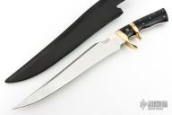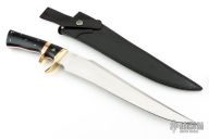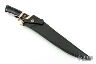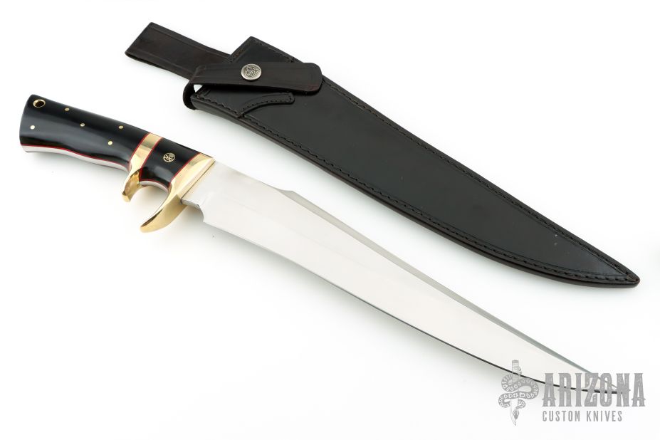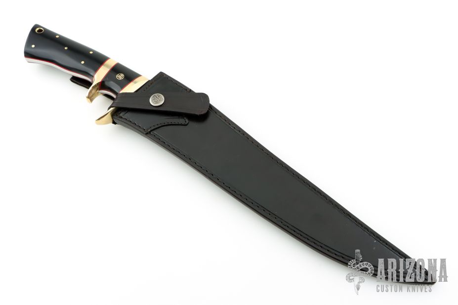 This Sub-Hilt Boar Hunter from Ricardo Perpina features a satin/polish finished blade with a false top edge and a full tang construction, .236" blade stock and 1.920" blade depth.  The handle has a brass guard and sub-hilt with black scales and red liners, brass and mosaic and pins. Comes with a hand tooled leather sheath. New from maker!