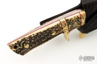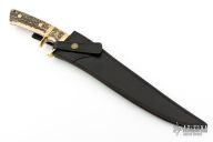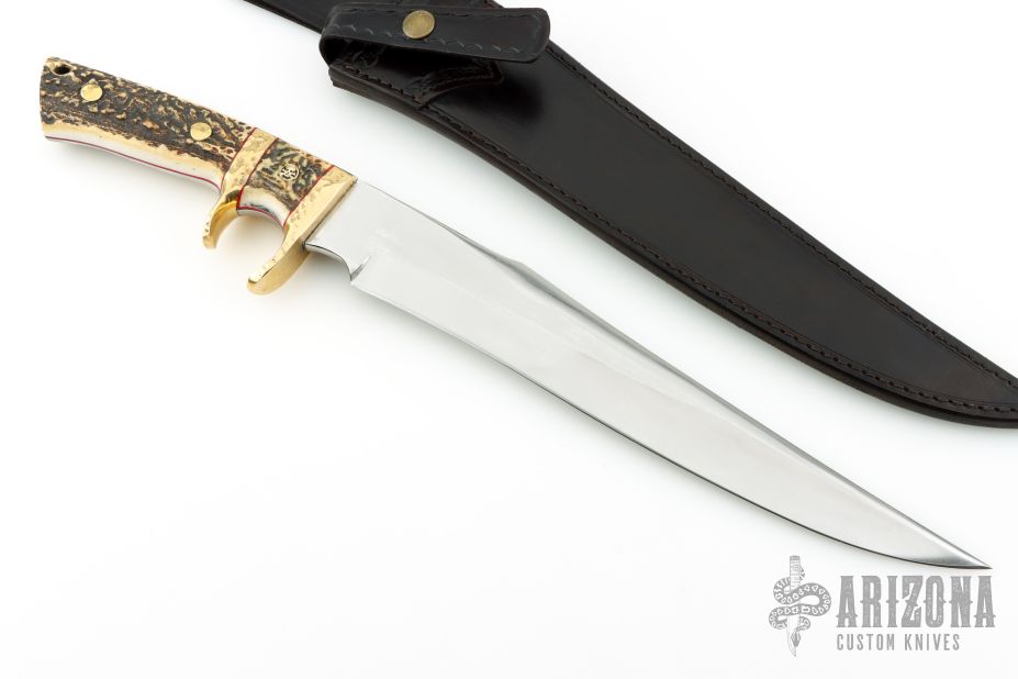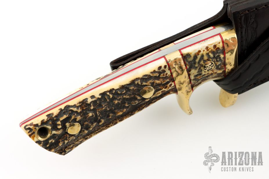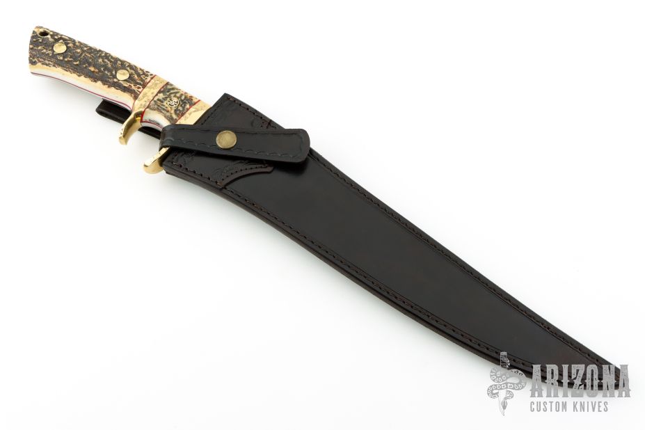 This Sub-Hilt Boar Hunter from Ricardo Perpina features a satin finished blade with a false top edge and a full tang construction, .231" blade stock and 1.76" blade depth.  The handle has a carved brass guard and sub-hilt with stag scales and red liners, brass and mosaic pins. Comes with a hand tooled leather sheath. New from maker.
