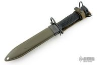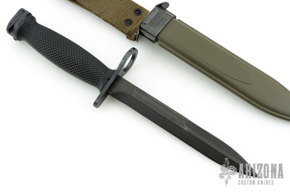 This M7 Bayonet by Colt features a black blade with sharpened top edge, .199" blade stock, and .869" blade depth, hidden tang construction. The handle has checkered plastic handles. Metal ring and pommel. Comes with original sheath. Has some light scuffs, excellent condition otherwise.